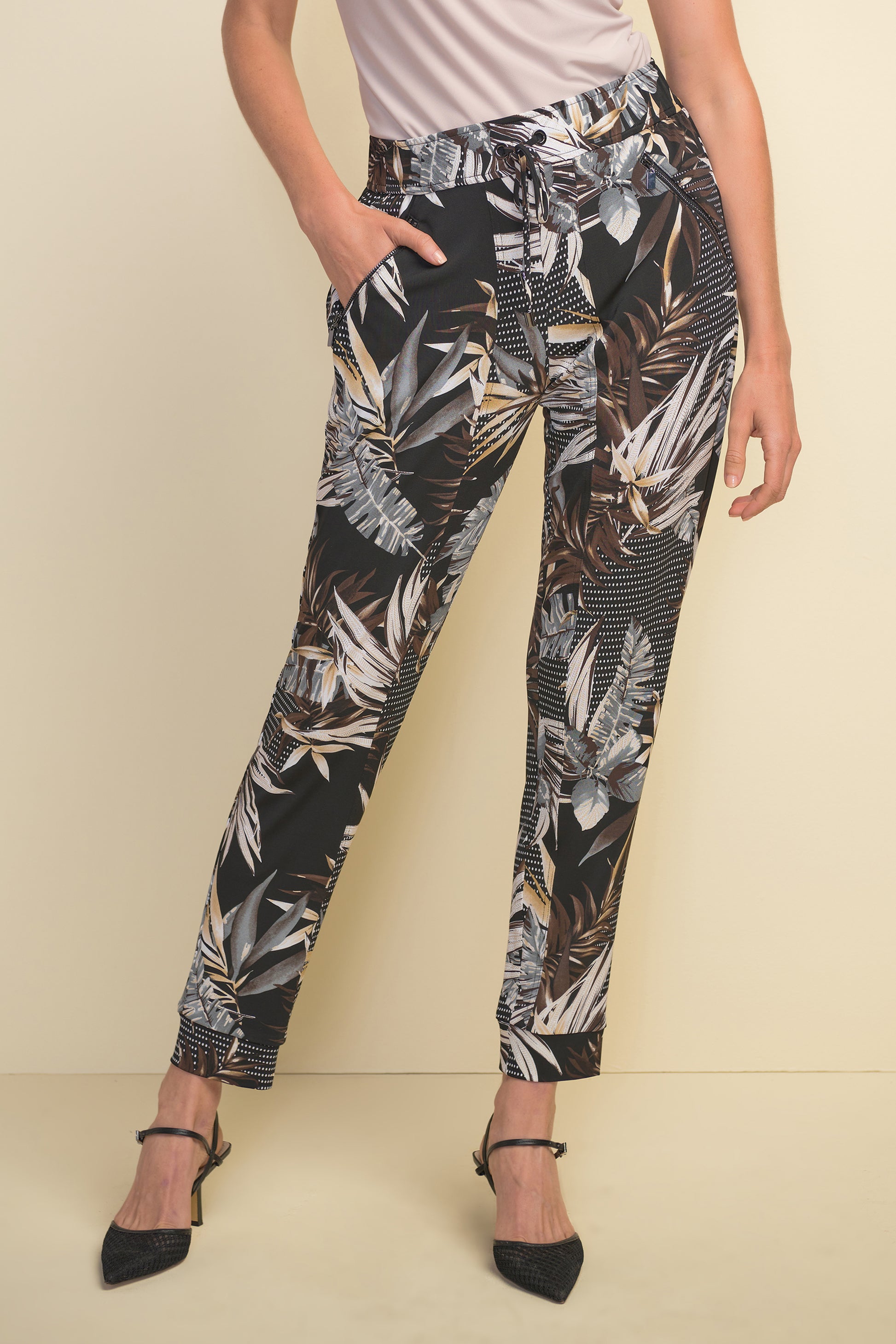 Pantalón negro con estampado de hojas y puntos en colores café, gris y blanco. Pretina con cintila para ajuste, bolsas inclinadas al frente con cierre.