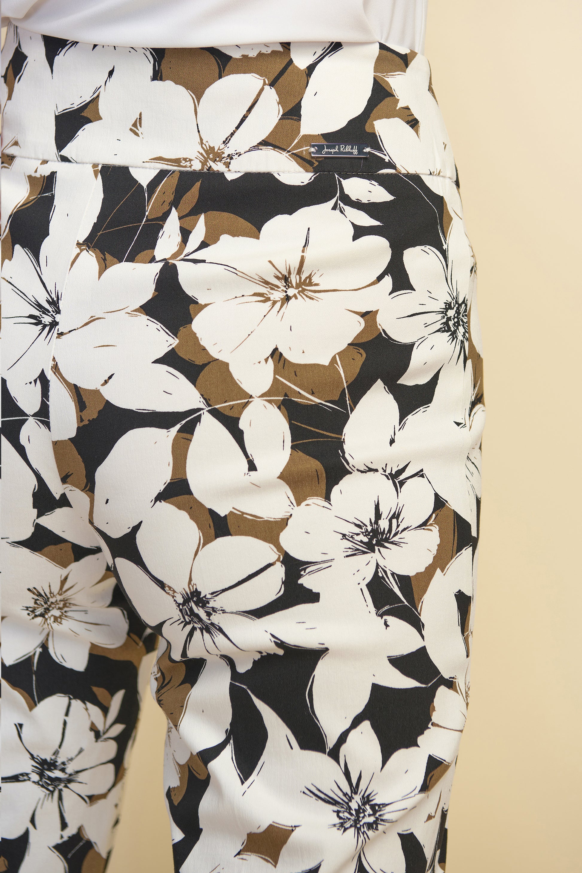 Pantalón negro con estampado de flores blancas y kaki, corte ajustado, sin bolsas.