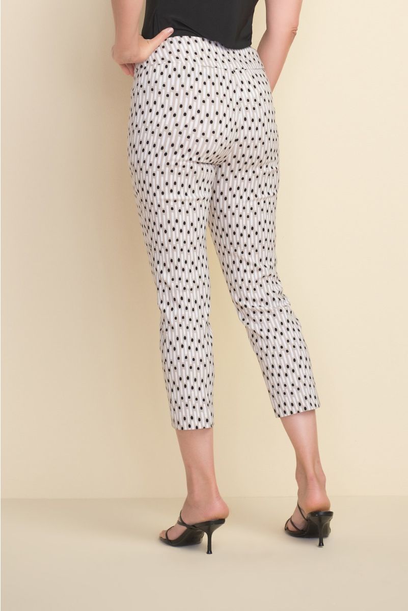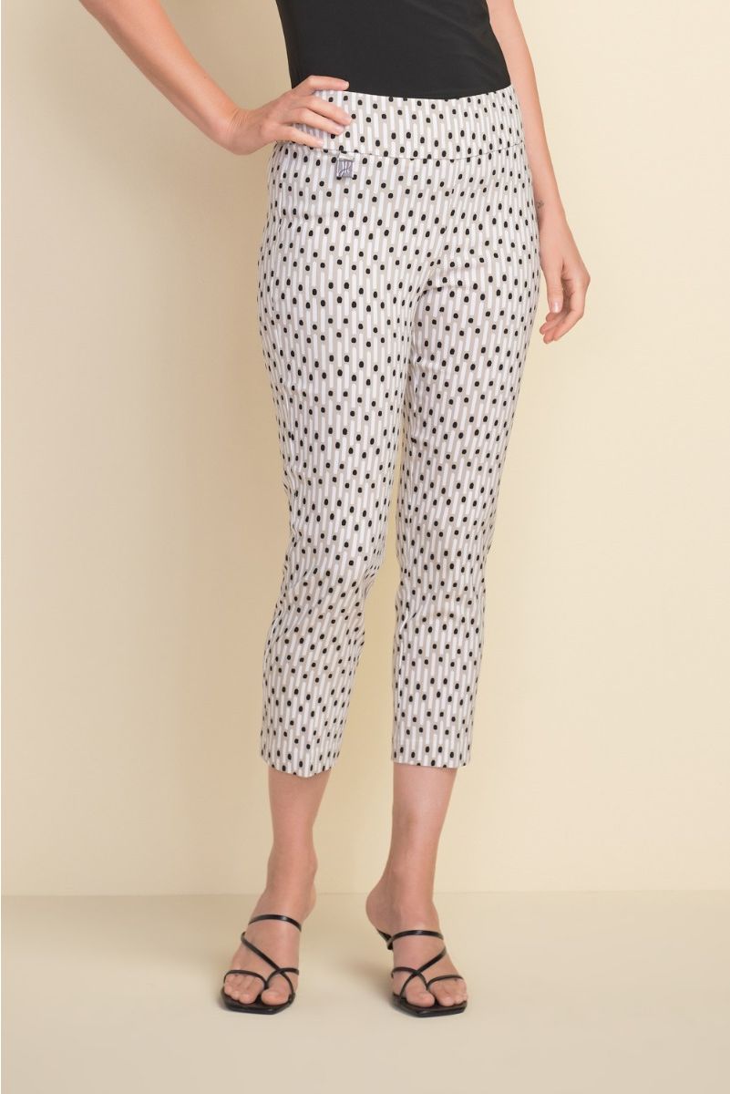 Pantalón para dama color arena con estampado abstracto en tonos blanco y negro, sin pretina, sin bolsas, sin cierre.