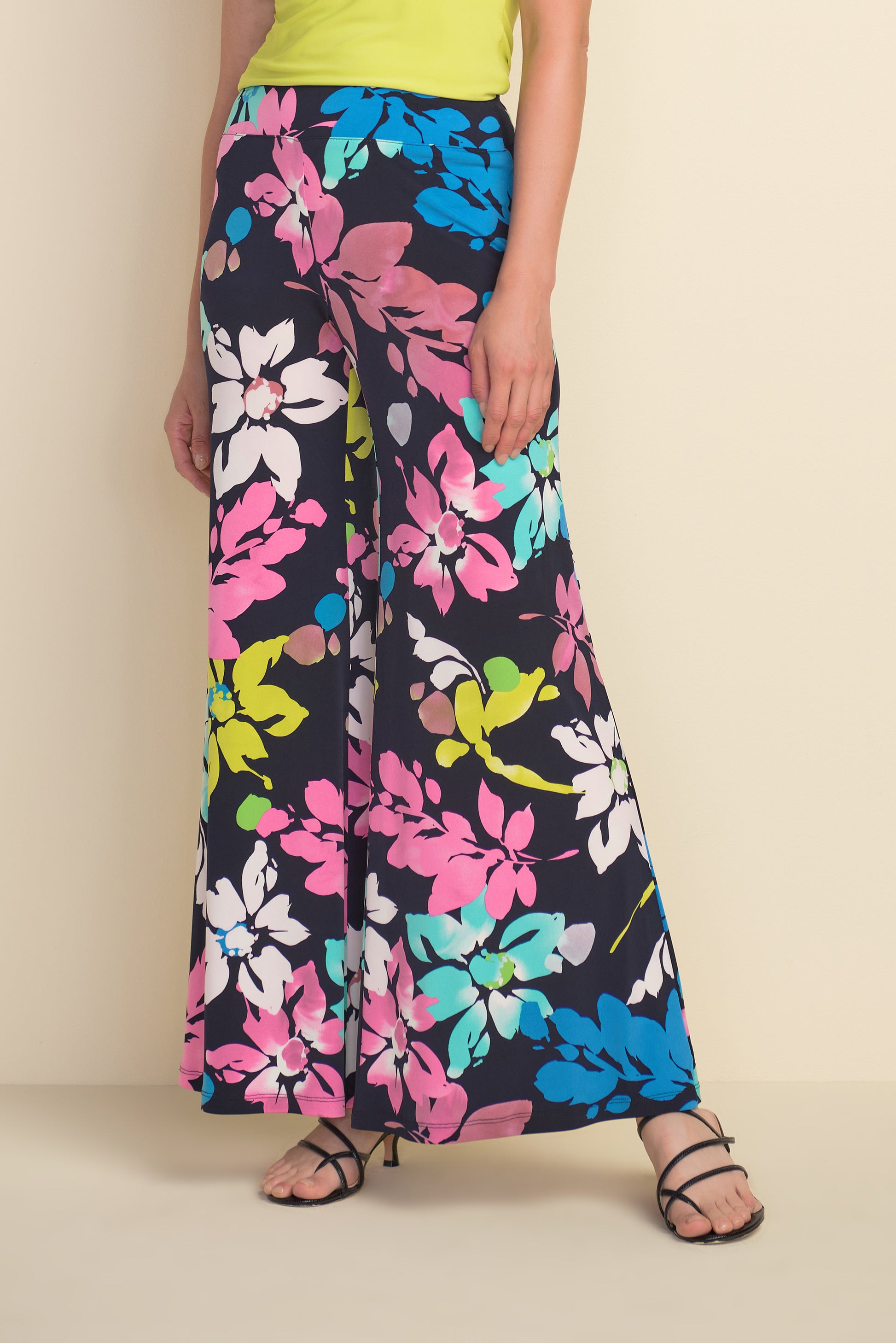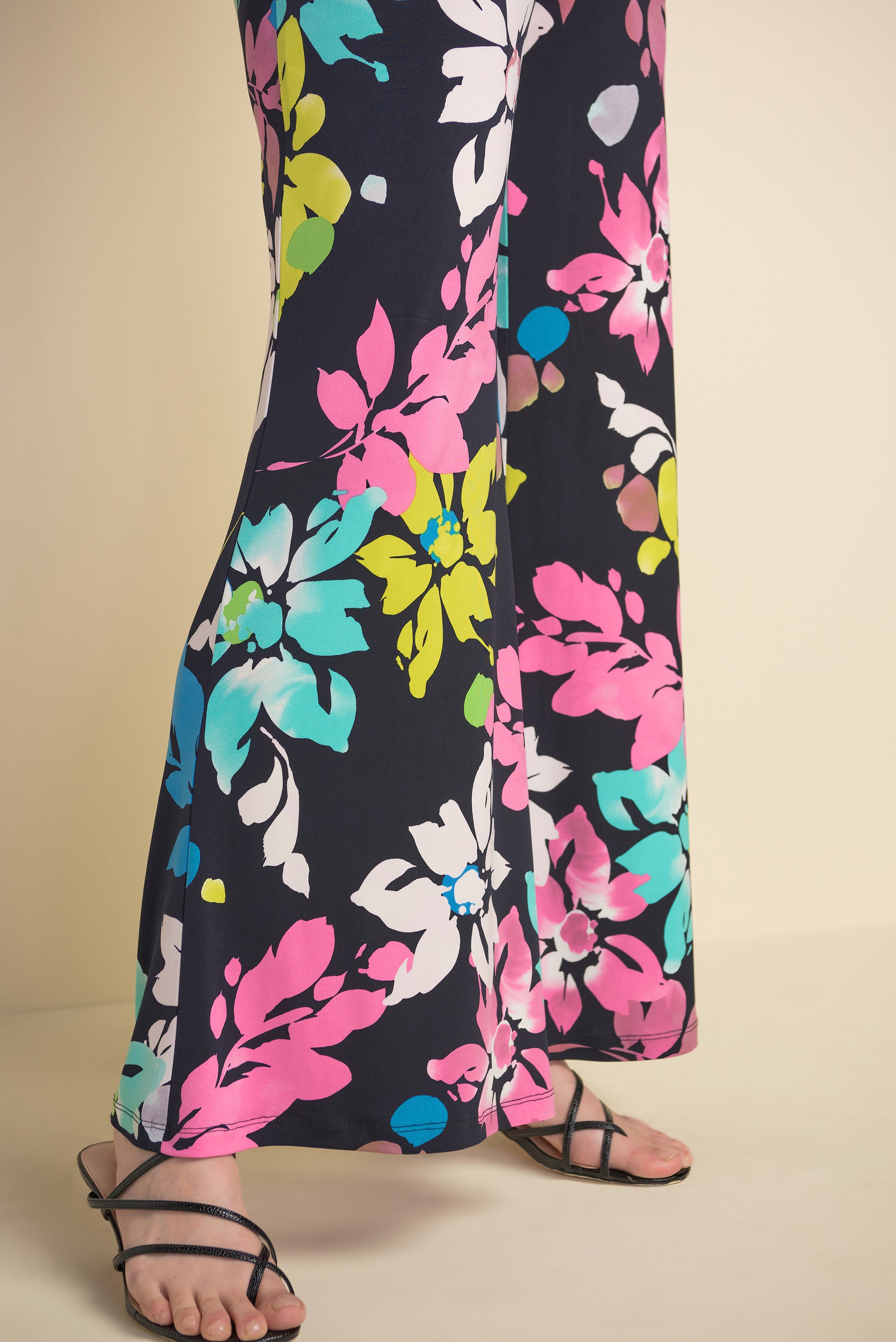 Pantalón azul marino con flores rosas, azul claro, turquesa y amarilla.