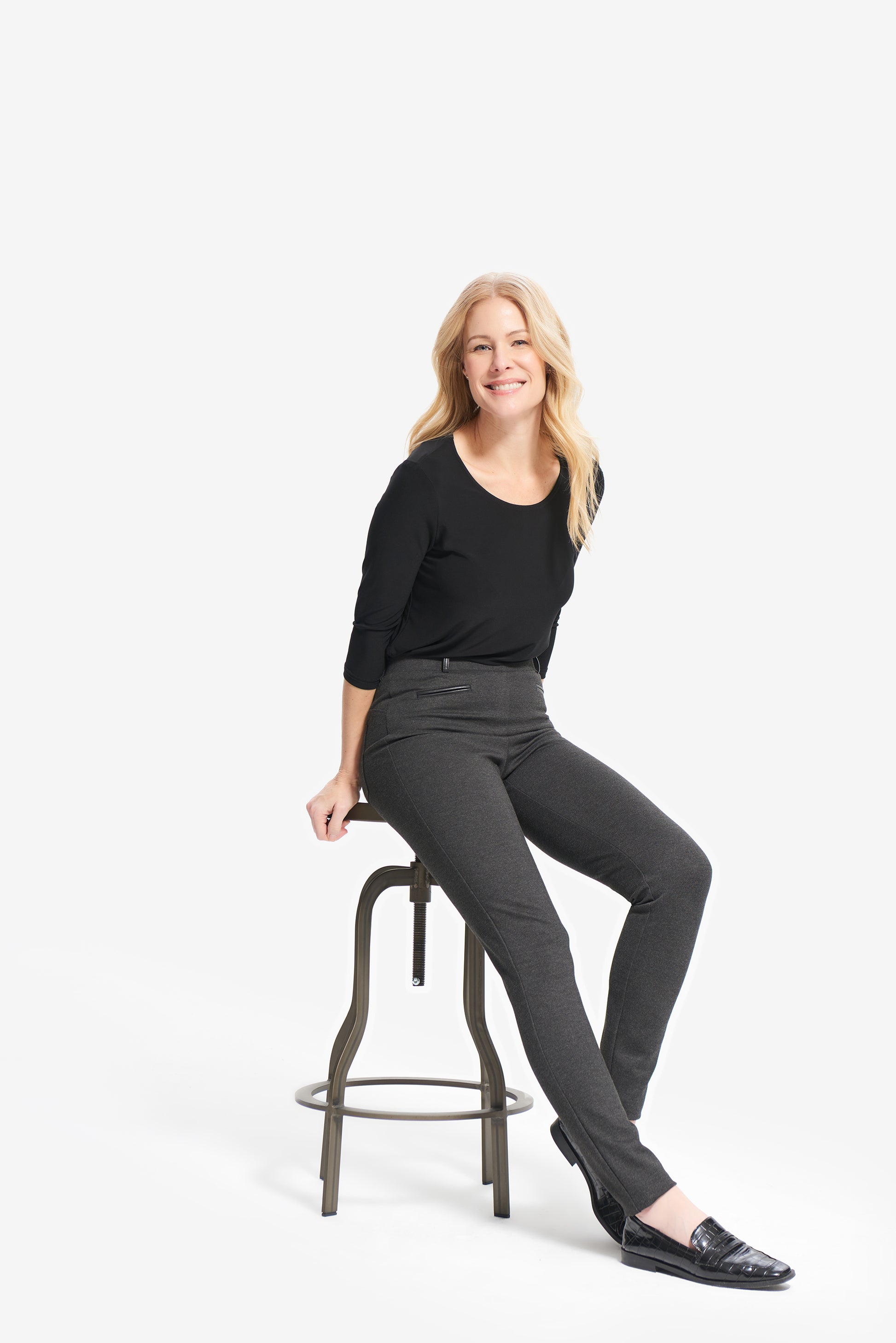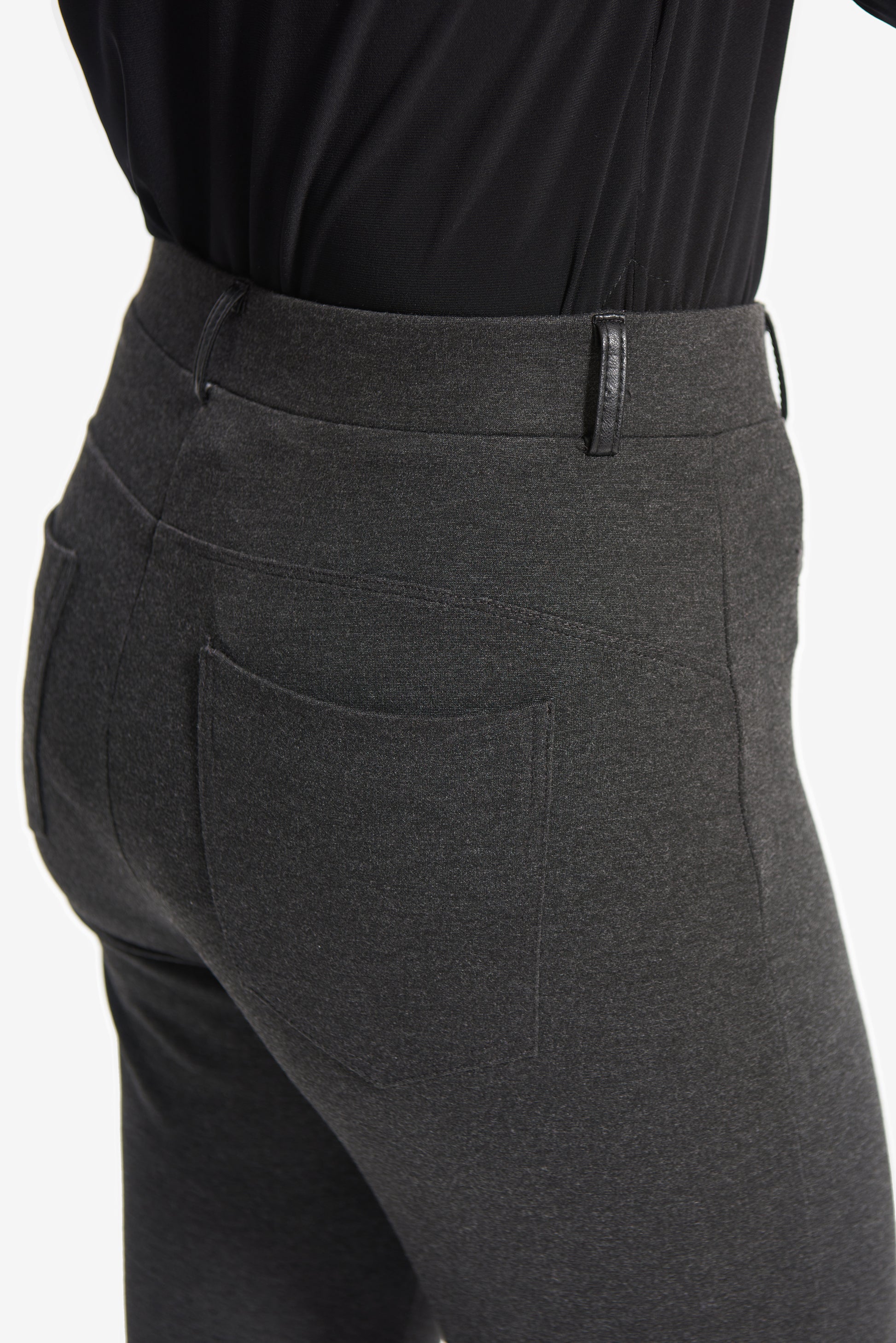 Pantalón para dama color gris oscuro, presillas en imitación piel, bolsas inclinadas incrustadas al frente de vivo en imitación piel, bolsas de parche traseras.
