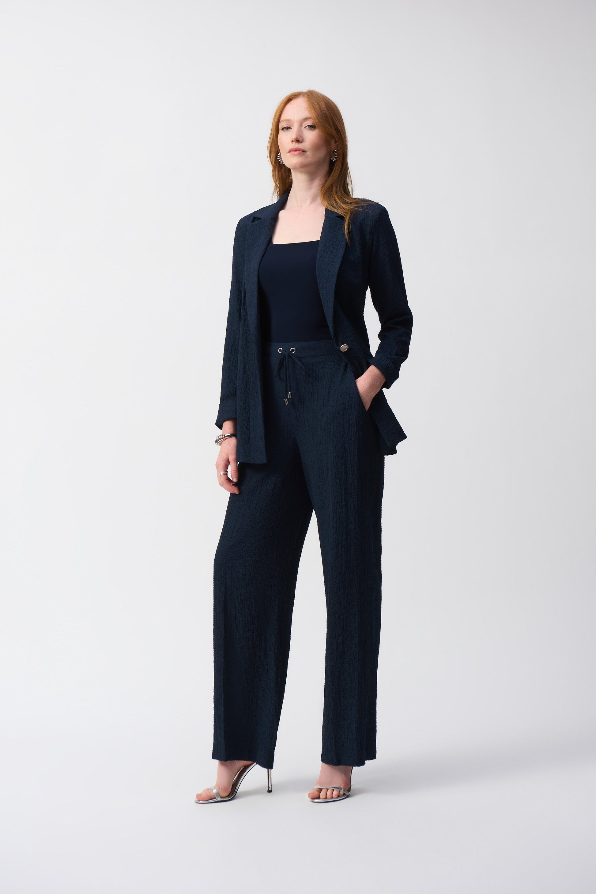 Pantalón con cordón en cintura y bolsas laterales. Composición 59% Poliéster 40% rayón viscosa 1% Elastano