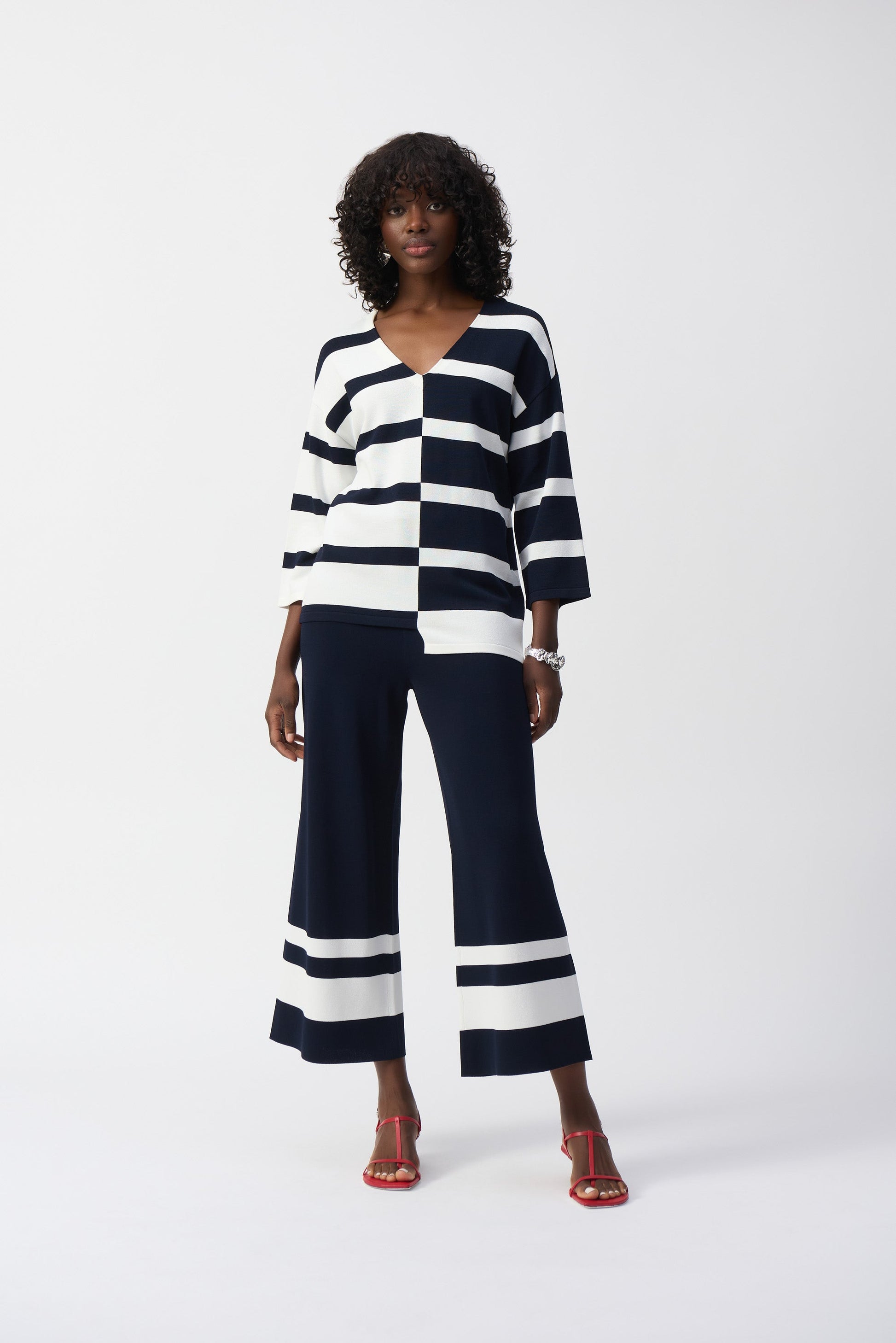 Pantalón pierna amplia de punto de verano con lineas blancas. Composición 80% Rayón viscosa 20% nylón