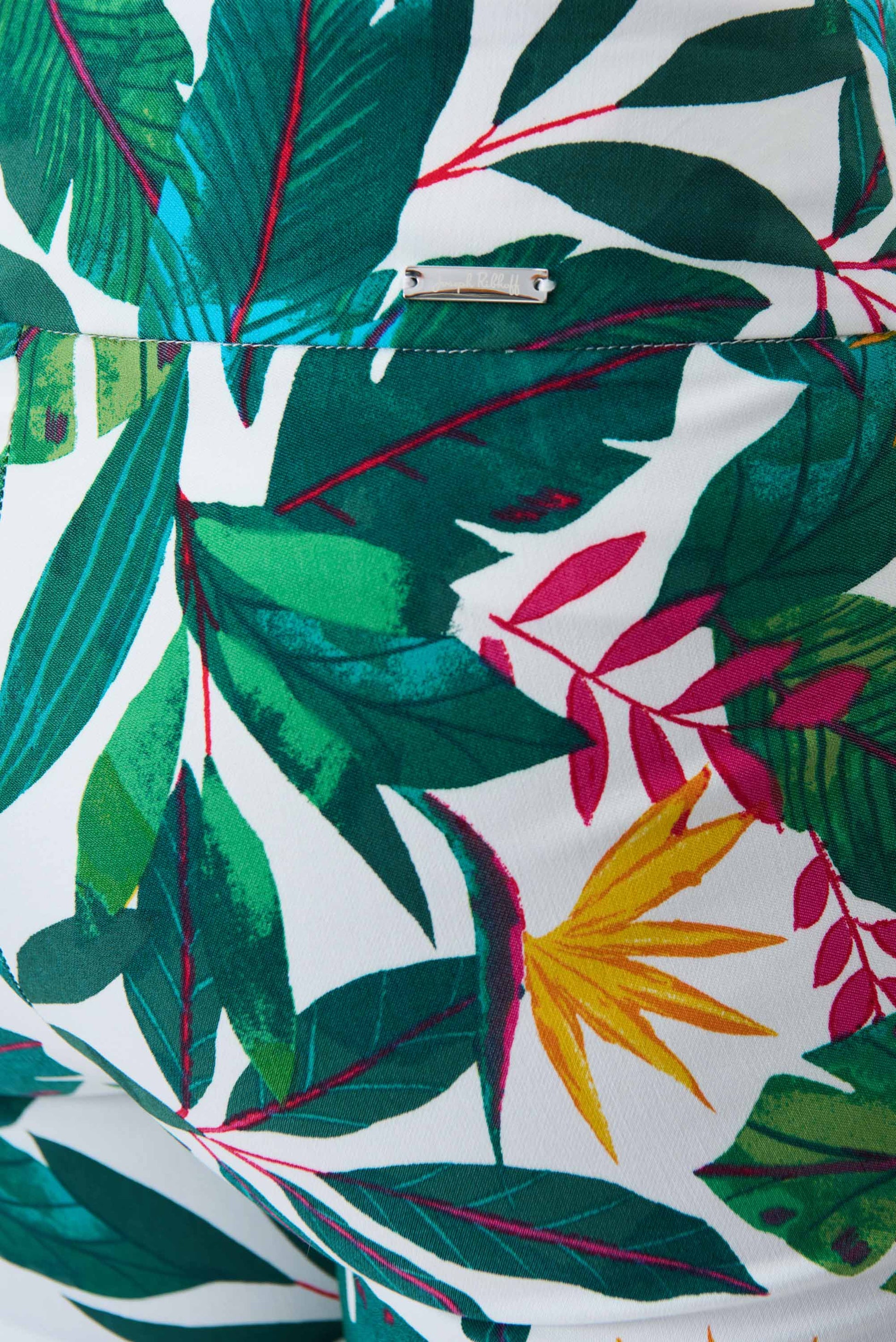 Pantalón para dama con estampado de hojas en tonalidades verdes, con cintura elástica y sin cremallera, ligeramente recortado a la bastilla.