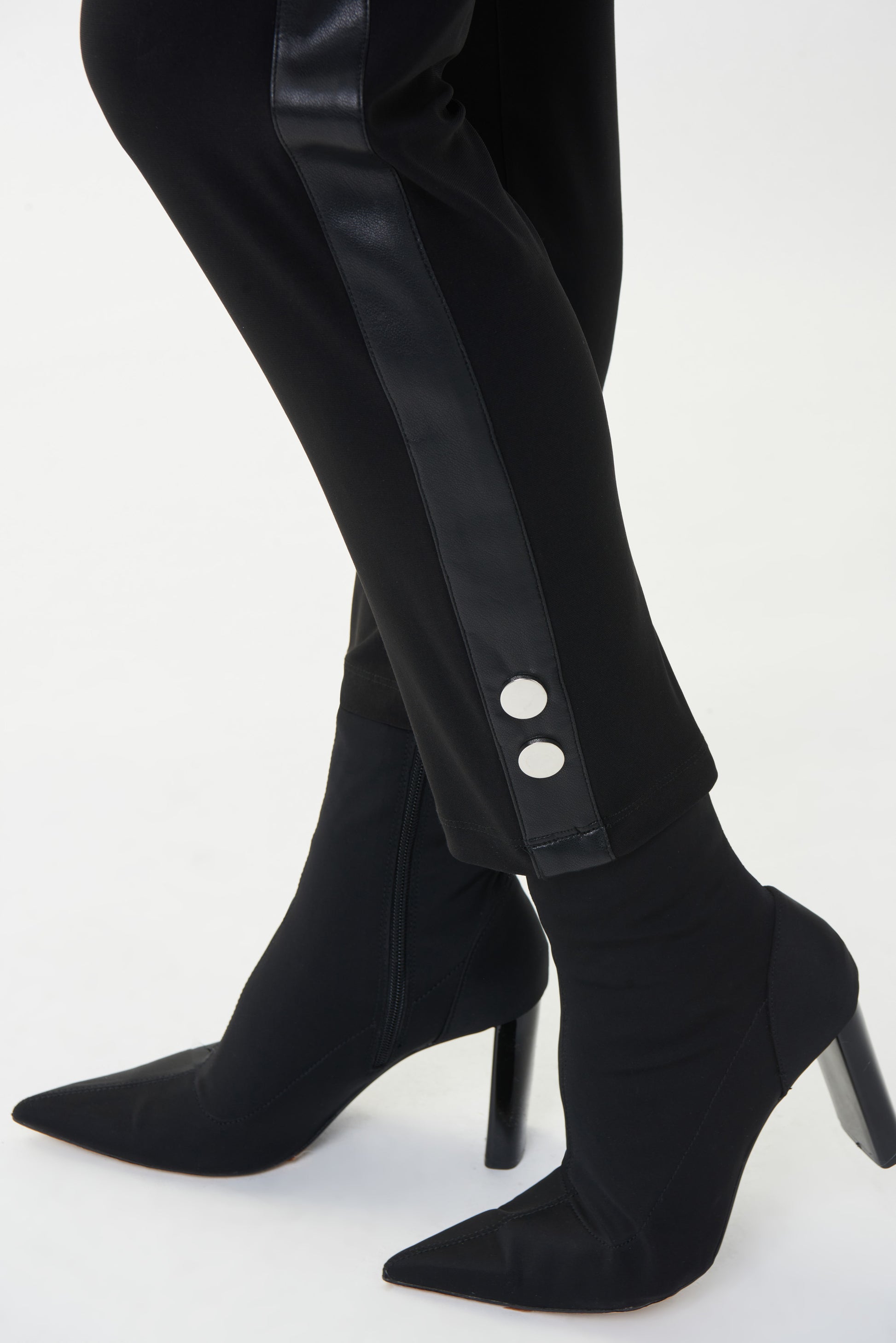 Pantalón capri para dama color negro con franja lateral de ecopiel, botones metálicos decorativos a la altura de los tobillos, jareta ajustable en cintura, corte entubado,