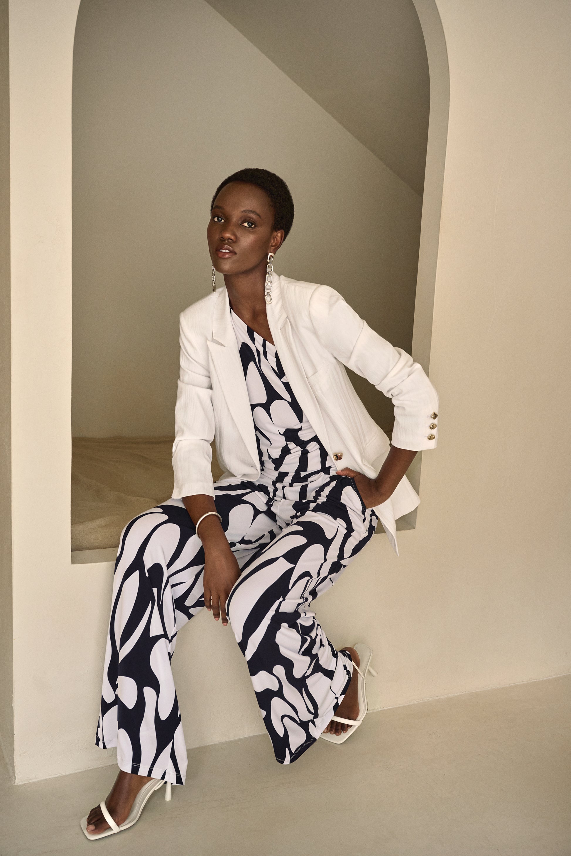 Con este impresionante top, entrará en cualquier habitación con estilo y gracia. La prenda, que está confeccionada en un tejido de punto de seda, luce un bonito estampado geométrico que le da un toque dramático a cualquier conjunto. El corte ajustado de este diseño con un hombro descubierto eleva su encanto chic, mientras que el fruncido del lateral acentúa el favorecedor corte del top.