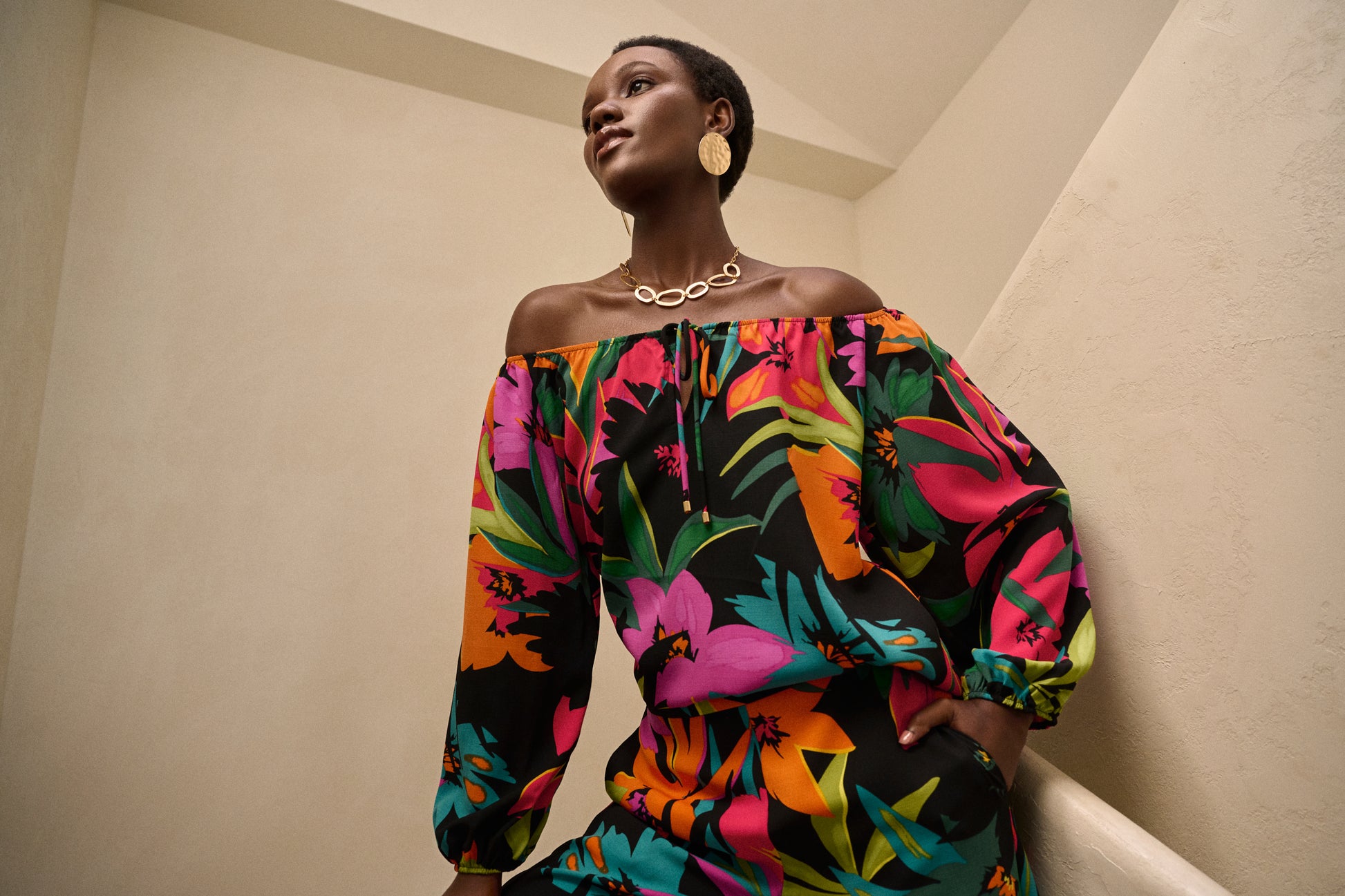 Este precioso top de gasa, toda una sinfonía de diseños vibrantes, evoca el irresistible encanto de las escapadas soleadas. El exquisito estampado tropical de la prenda eleva la elegancia desenfadada de su corte acampanado. Asimismo, las mangas raglán abullonadas de tres cuartos aportan un toque romántico a esta prenda contemporánea, mientras que el escote delantero en forma de ojo de cerradura, que va adornado con un delicado cordón, le permite ajustar la prenda a su gusto.