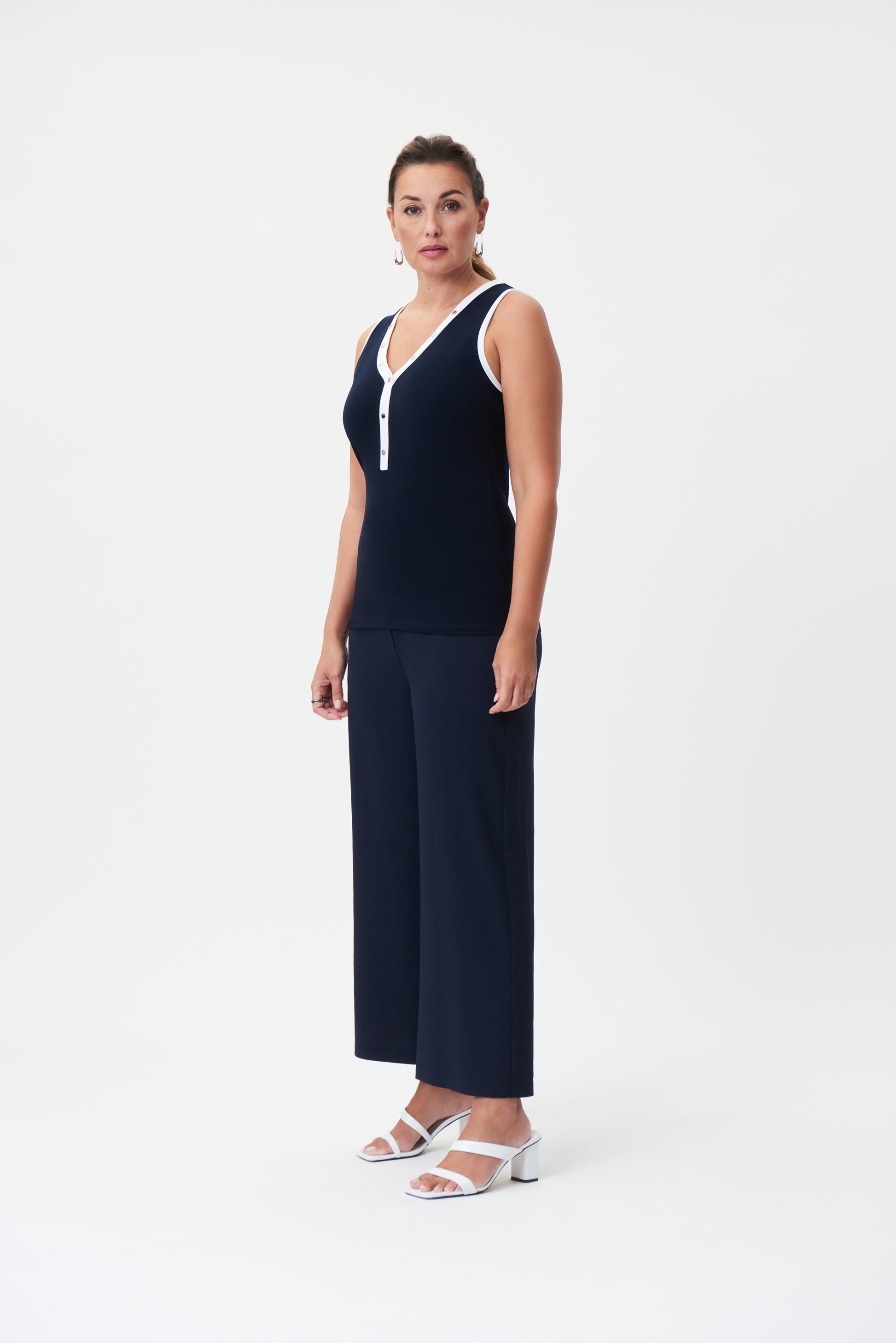 Top en color azul marino y detalles en vainilla, con escote en pico y corte sin mangas, cuenta con pequeños botones plata decorativos.