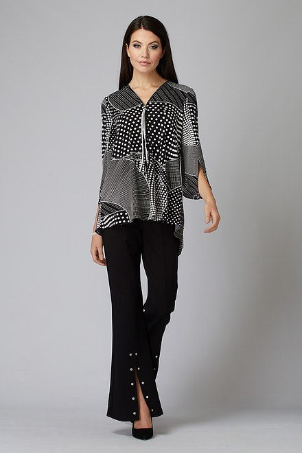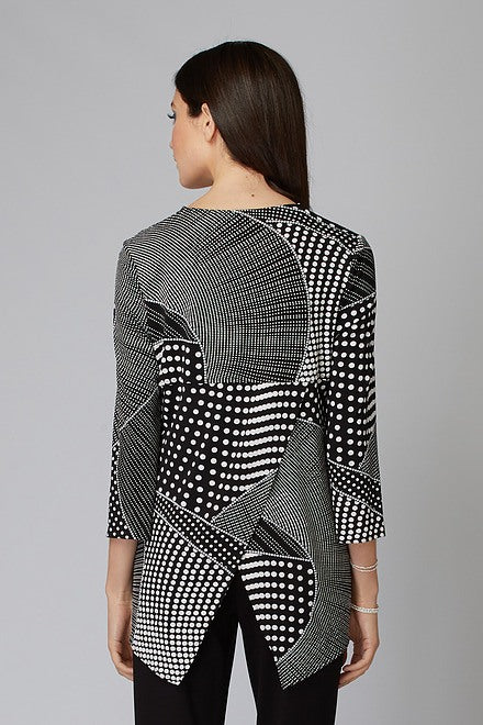 Esta túnica diseñada por Joseph Ribkoff tiene un cuello en V con cremallera único con un tirón largo, es un patrón bloqueado de lunares, tiene mangas de tres cuartos de longitud con hendiduras delanteras y envolturas en la parte posterior para crear un estilo de esmoquin.
