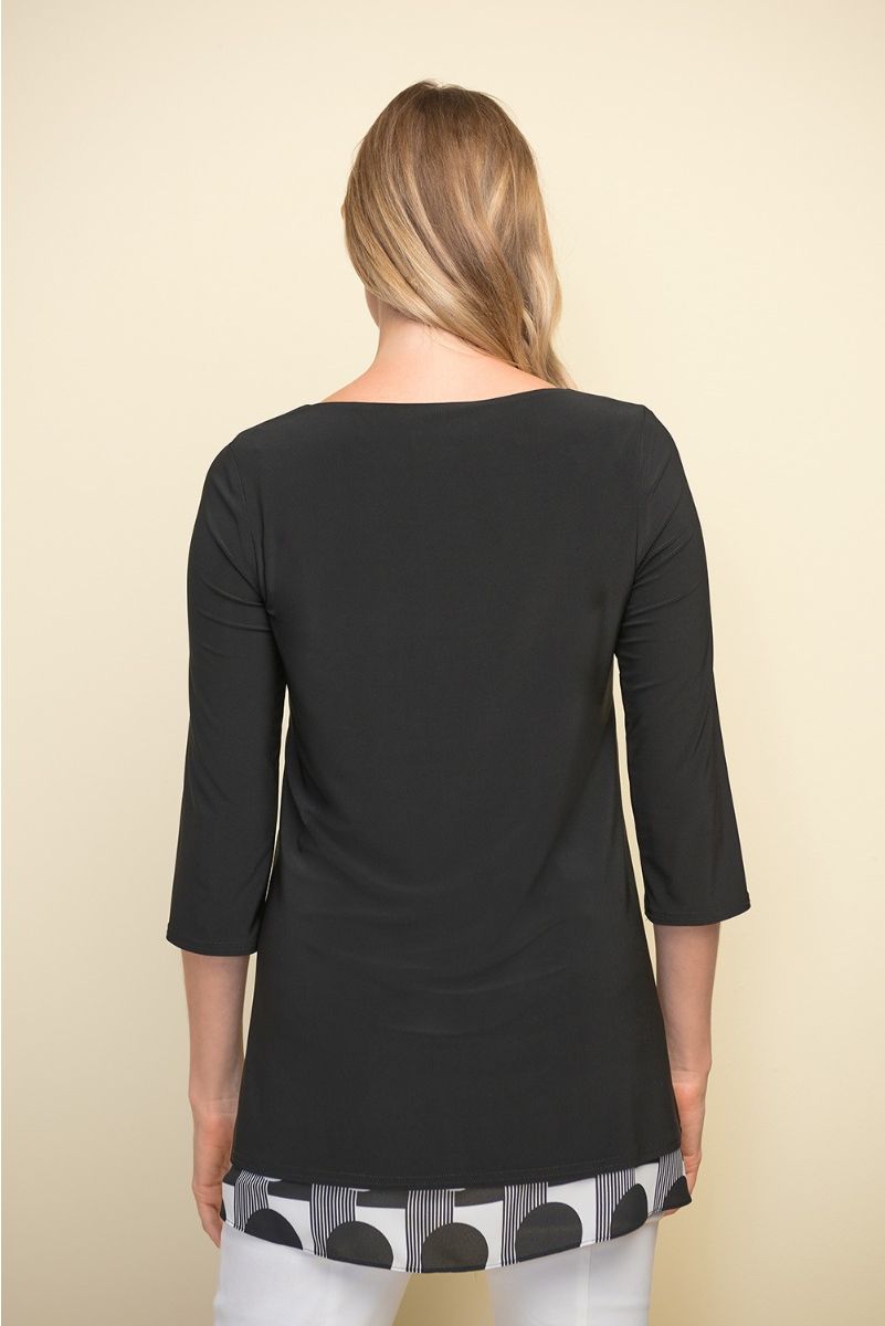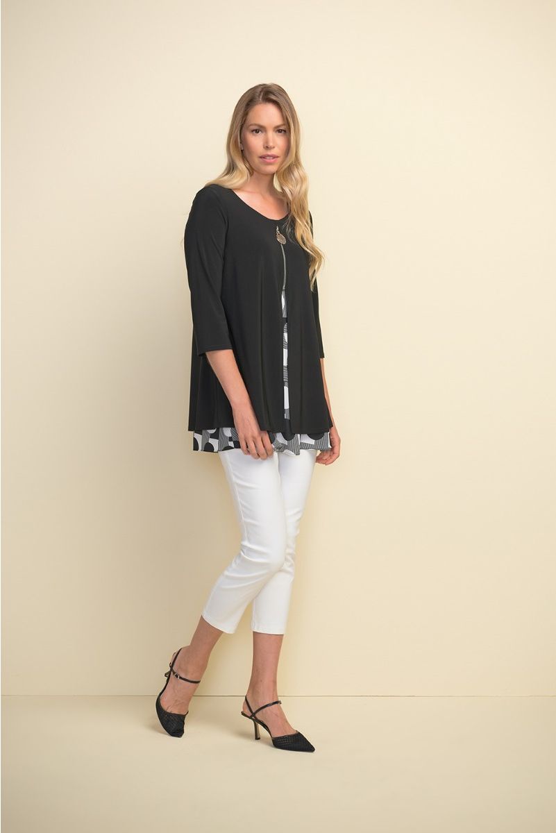 Blusa color negro, con capas inferior estampado en blanco y negro, cierre corto al frente con accesorio metálico, manga 3/4.