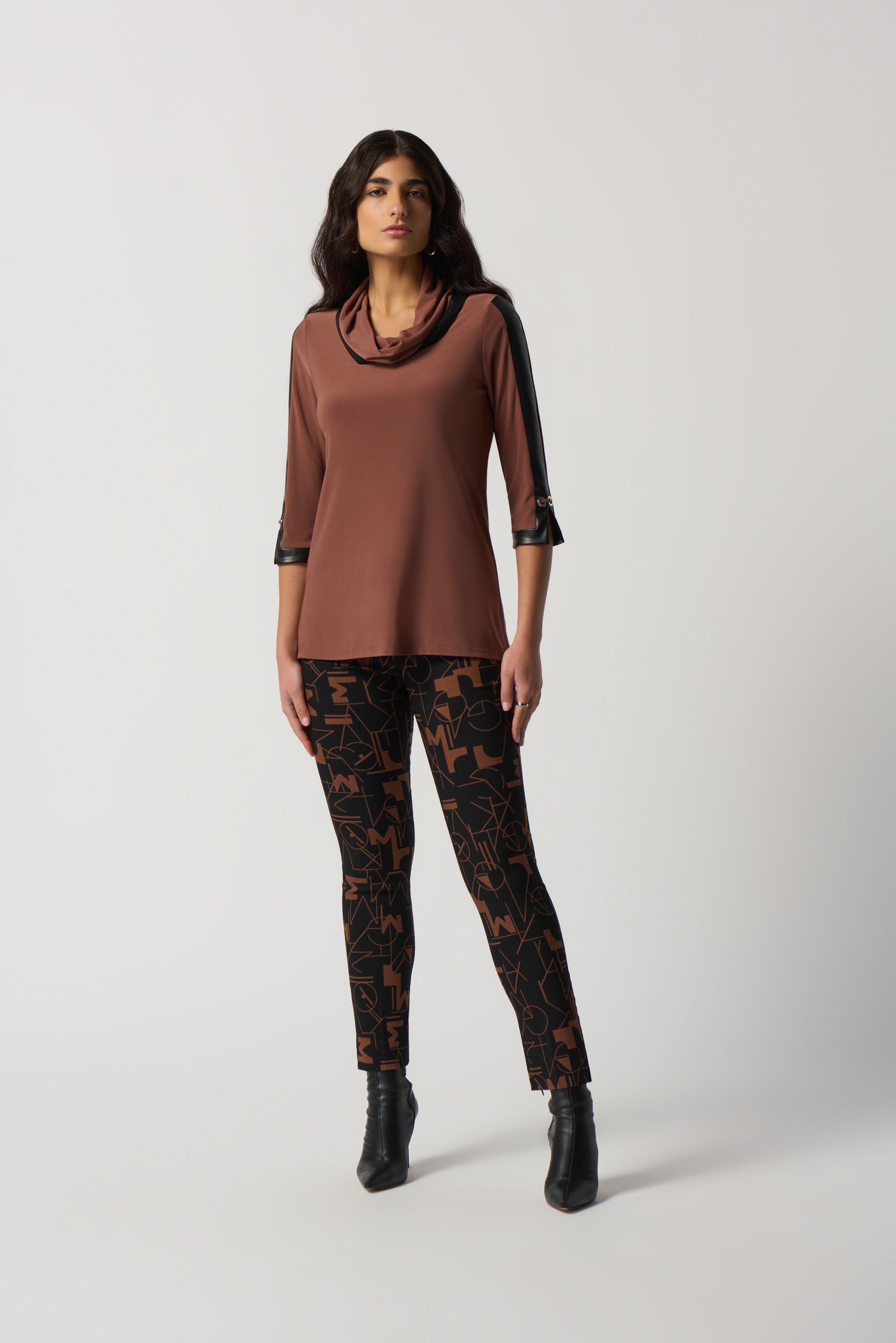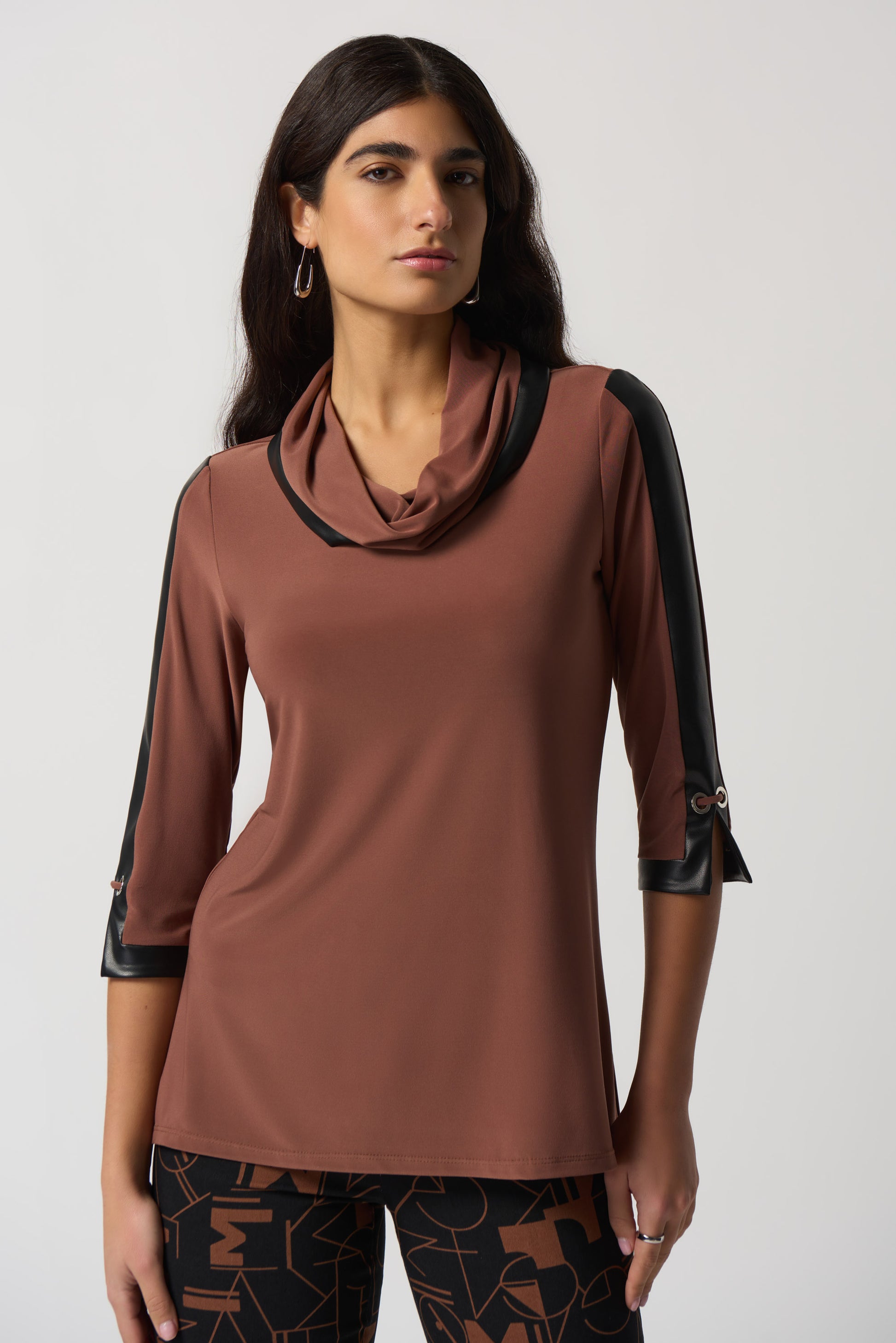 Esta blusa con contrastes en piel sintética es perfecta para pasar del día a la noche. El tejido de punto sedoso es muy suave y realza la figura, mientras que el aspecto de cuero le da un toque más moderno. El cuello fluido y la manga central tienen detalles de ojales para aportar un poco más de interés.