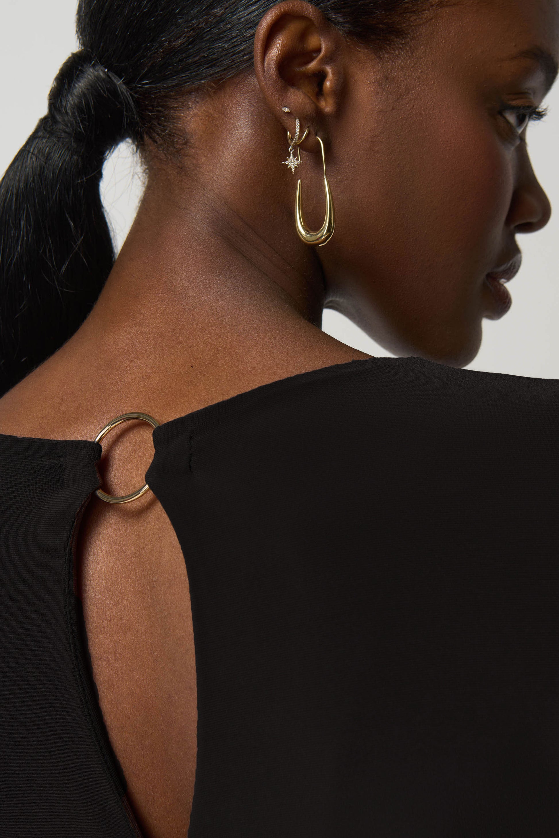 Póngasela en ocasiones formales e informales, esta túnica fácil de combinar se convertirá en una de sus prendas favoritas. Su diseño minimalista es perfecto para distintos estilos, a la vez que el escote en ojo de cerradura con detalles de anillos le da suficiente personalidad. La manga tres cuartos aporta cobertura, y el corte de trapecio le realza la cintura.
