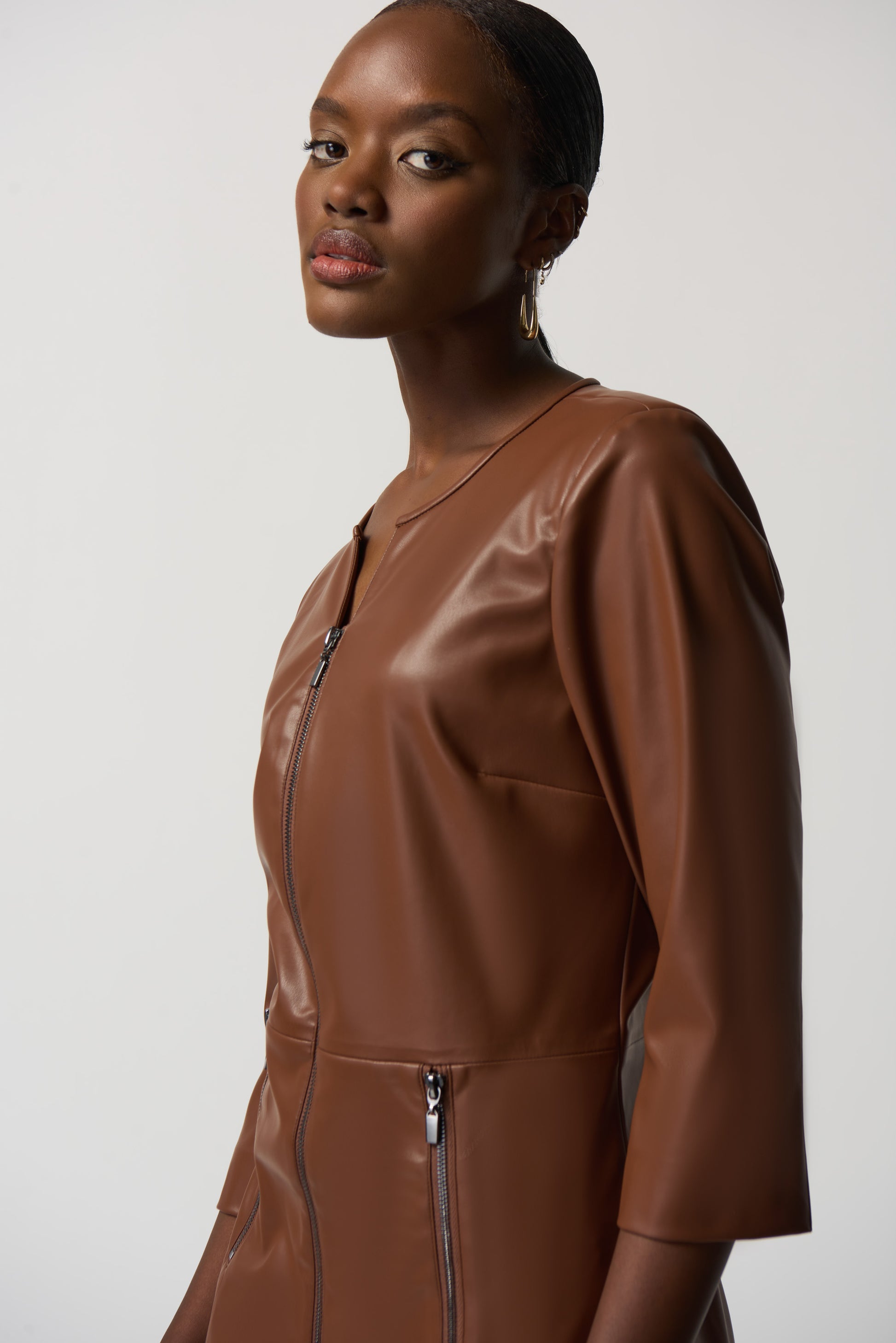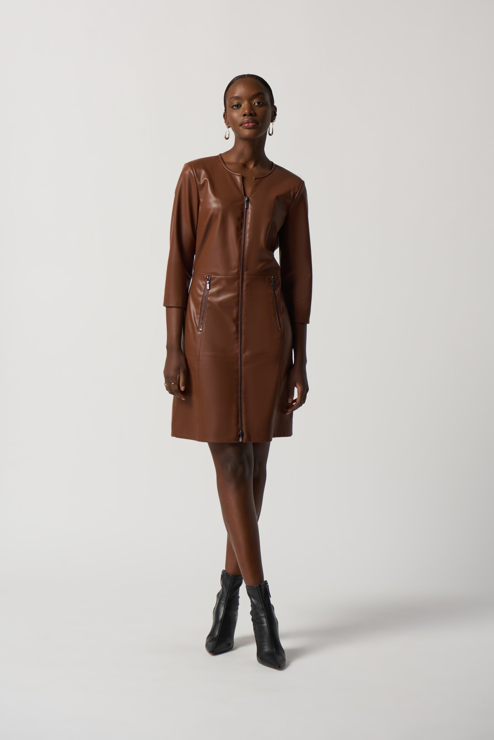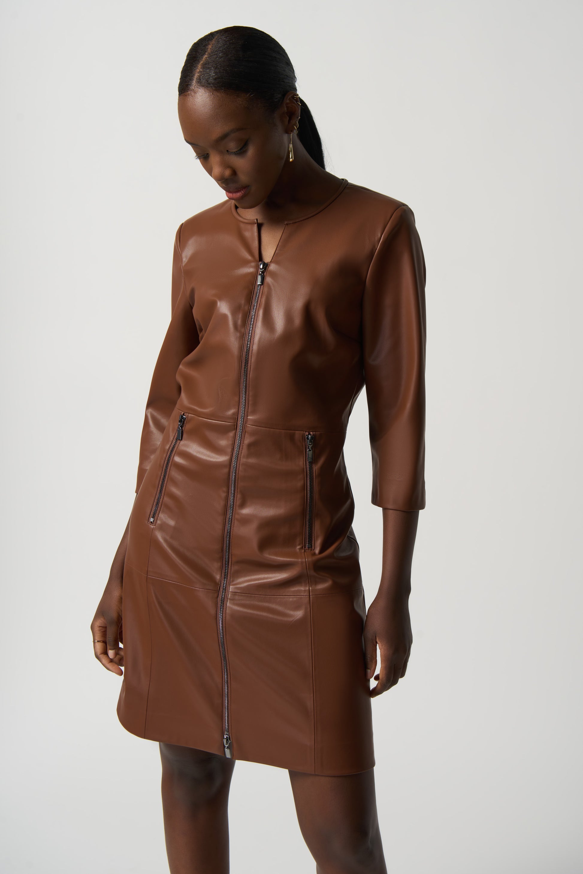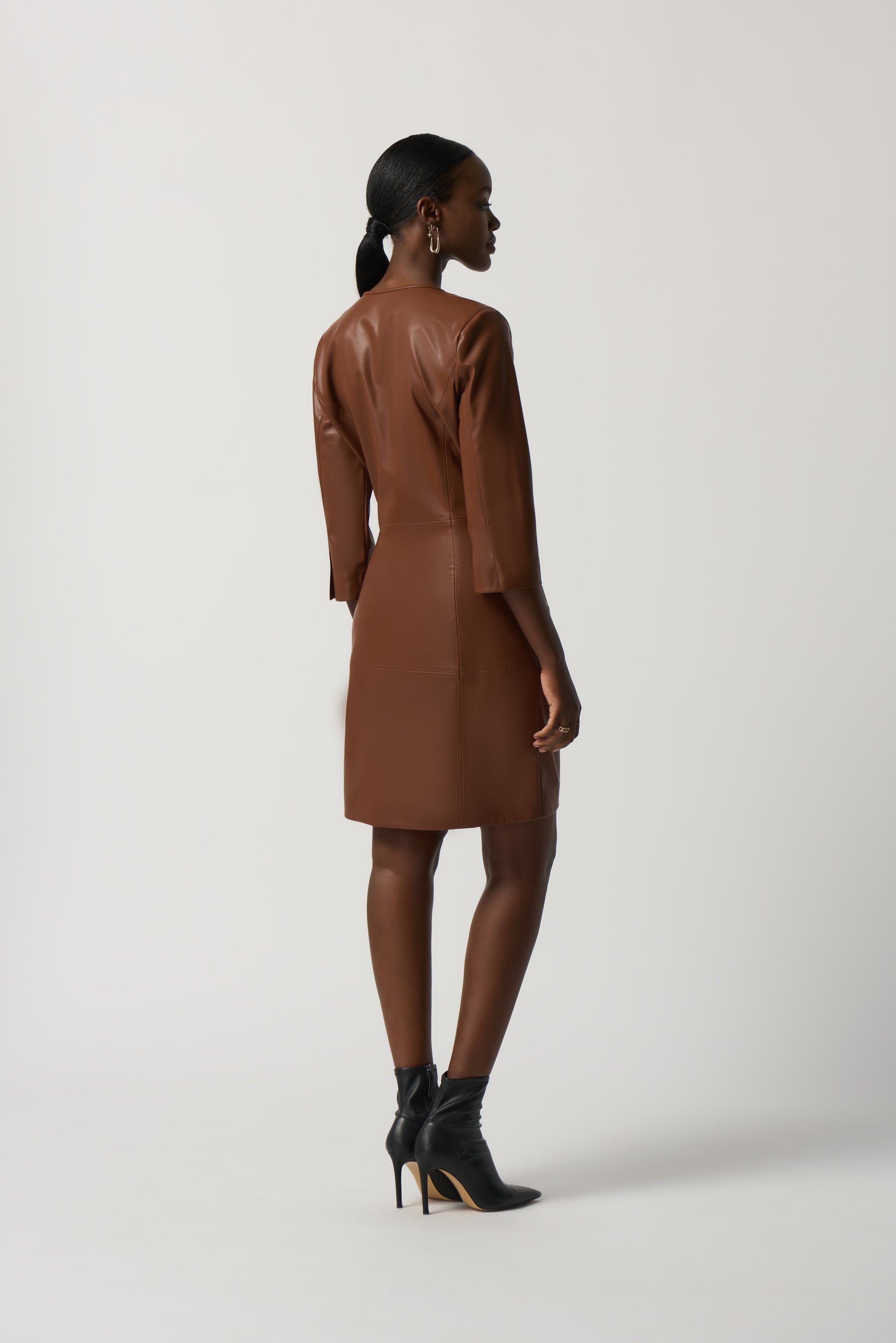 Las prendas de polipiel vuelven a estar absolutamente de moda, ¡y eso hay que celebrarlo! Este vestido liso de línea A, hecho de una piel sintética suave, presenta un escote redondo y una manga recta de tres cuartos. Queda justo por encima de la rodilla, por lo que es la opción perfecta tanto para salir por la noche como para un día en la oficina.
