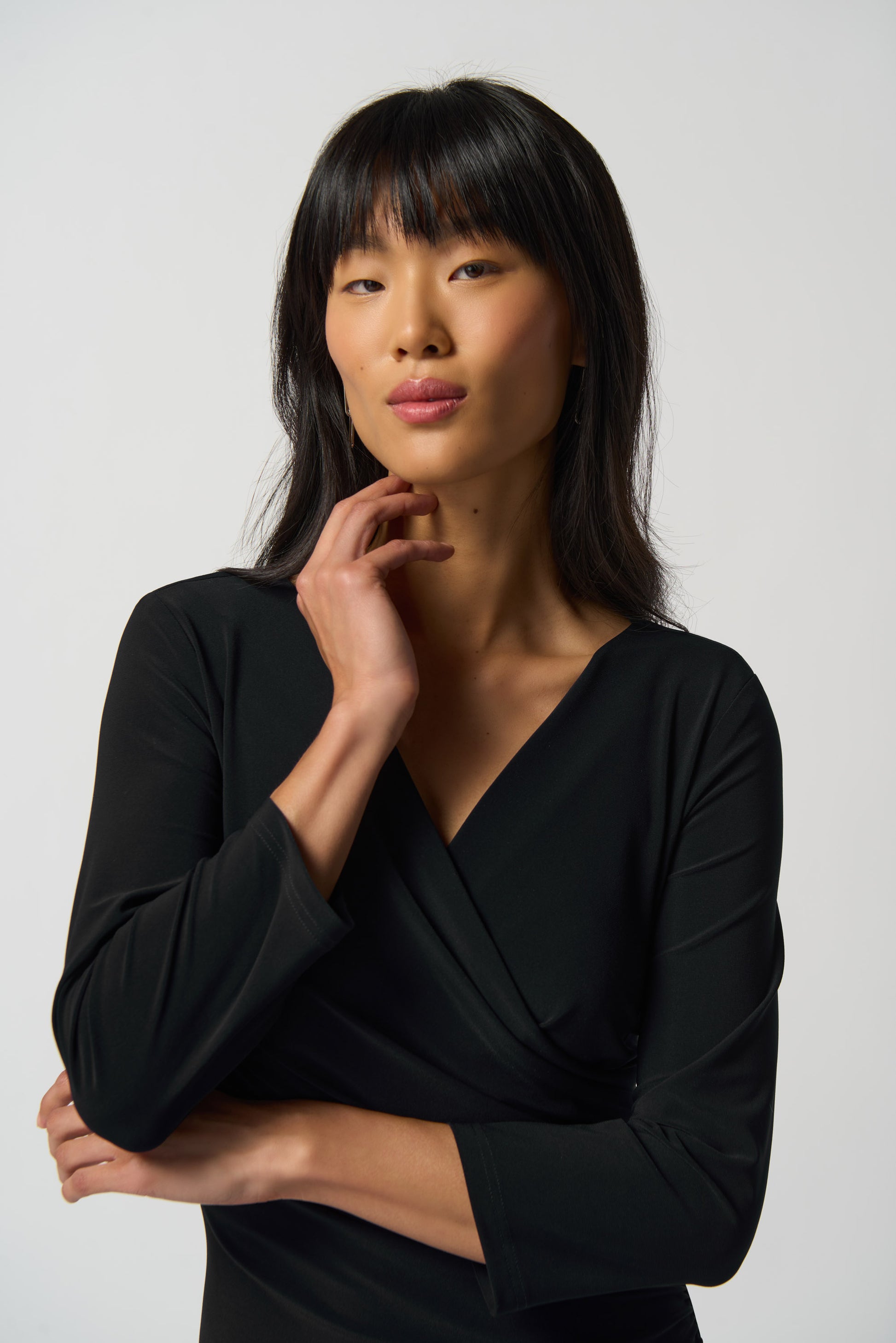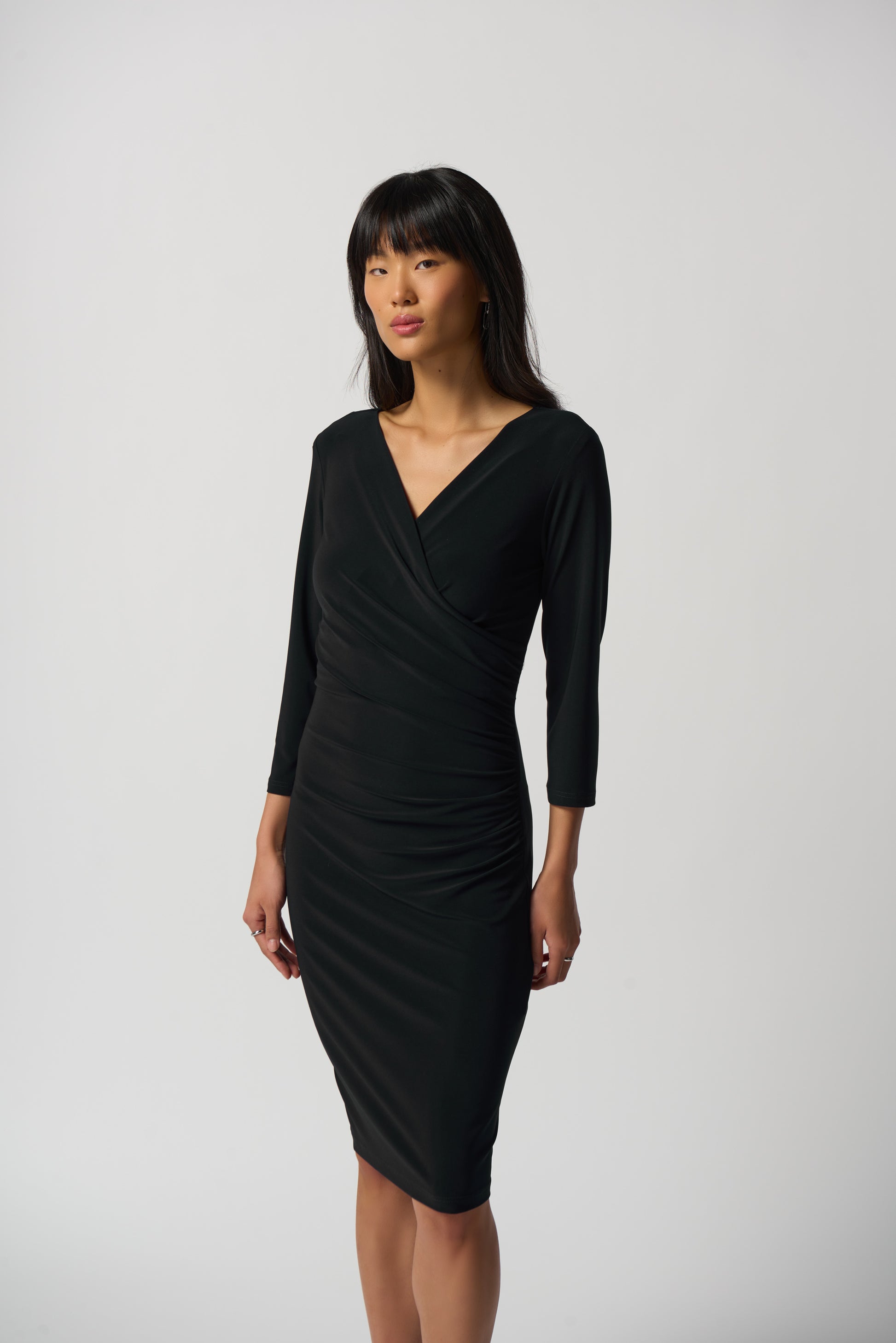 Este vestido negro sin duda aporta un estilo atemporal y refinado para cualquier ocasión. Está confeccionado con un tejido de punto sedoso y lujosamente suave, además de presentar sutiles frunces en la cintura para conseguir un ajuste elegante y favorecedor. Este sofisticado vestido cruzado llega justo por encima de la rodilla y tiene manga 3/4, para que vista chic sin esfuerzo dondequiera que vaya.
