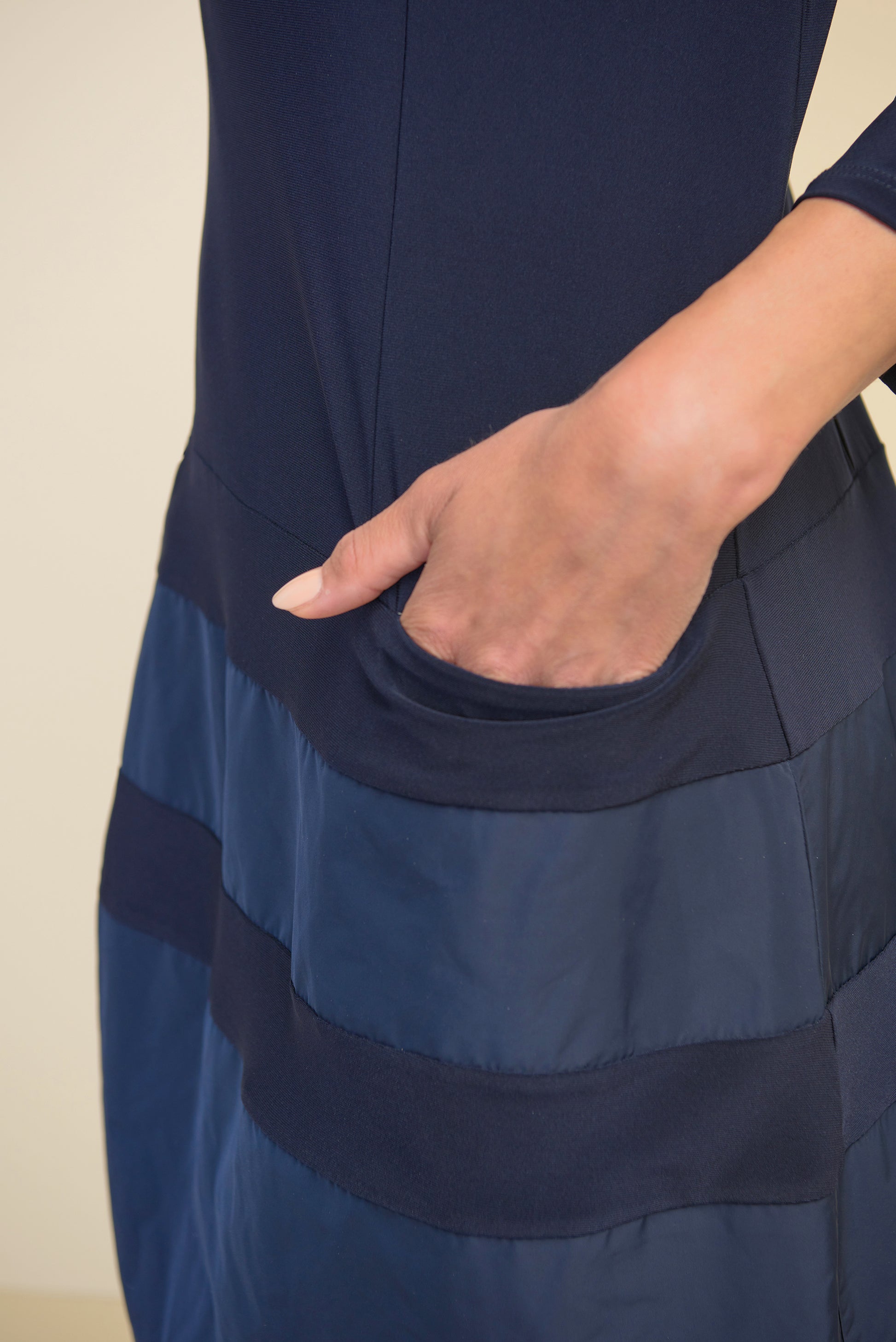 Vestido azul marino, cuello de cántaro, corte "A", cuello y ruedo en tela satinada, bolsas al frente,