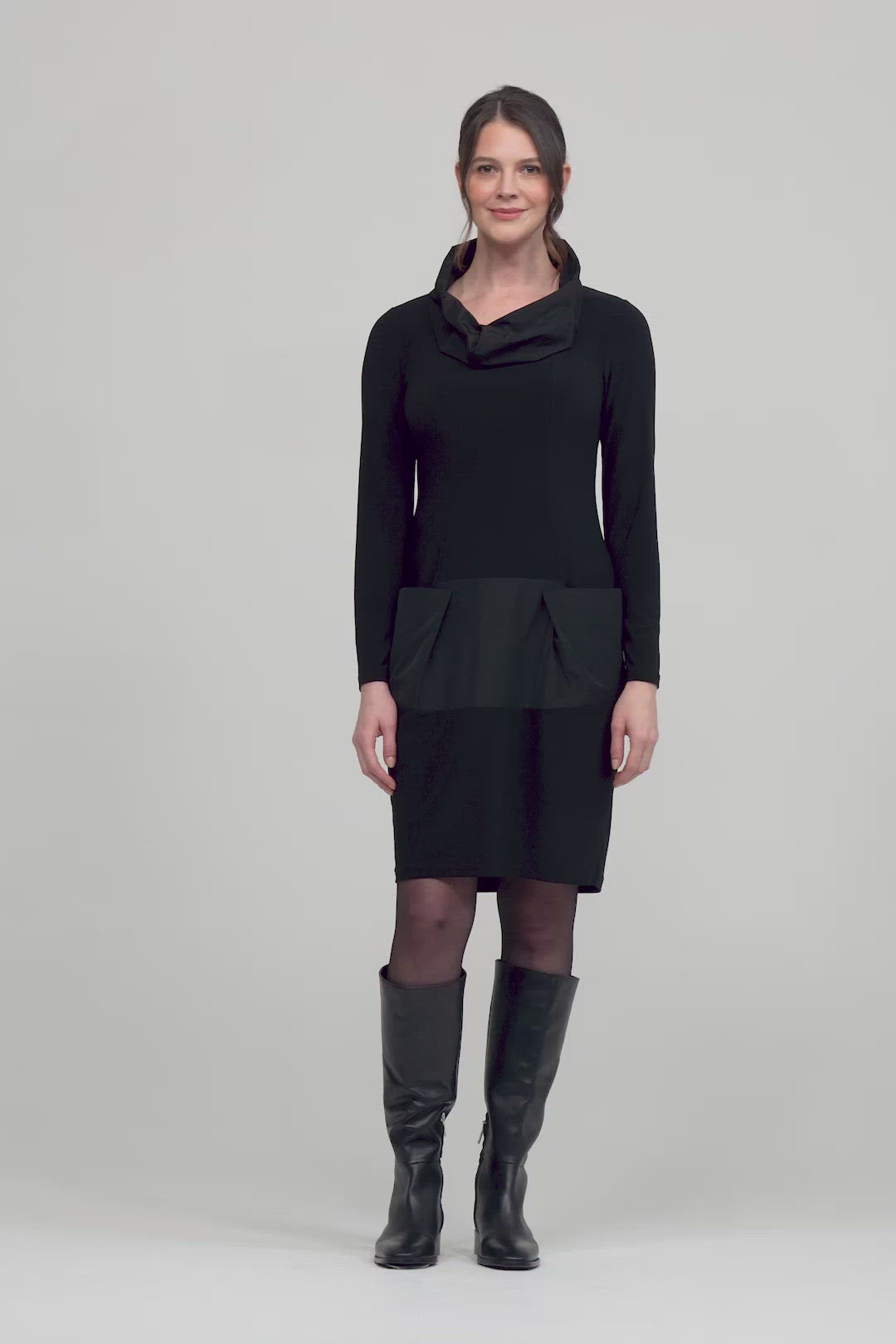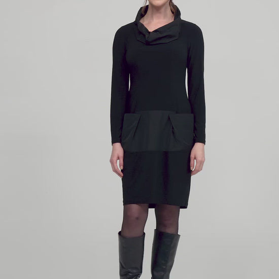 Vestido negro con cuello de cantaro, manga larga, bolsas frontales y corte en la cadera que forma bolsas, franja satinada en cadera y contraste de satén en cuello.