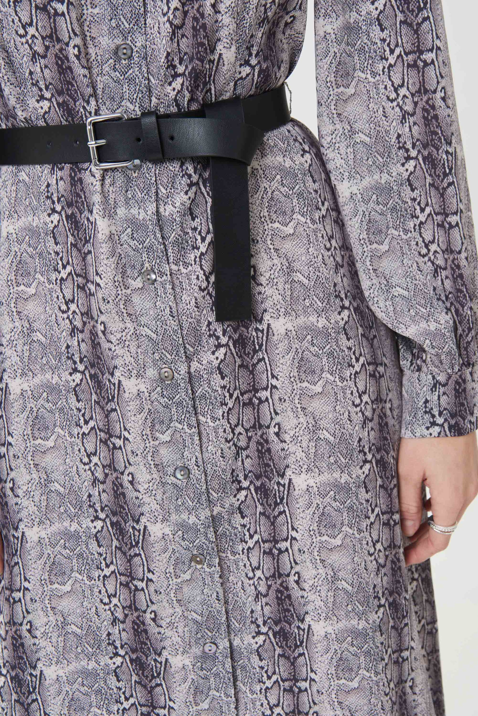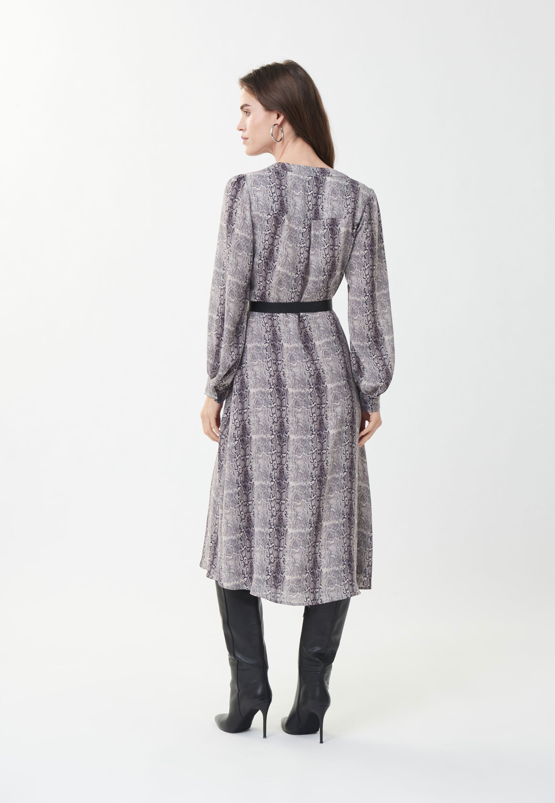 Vestido con estampado de animal print, escote en "V", frente abotonado, manga larga, con cinturón negro