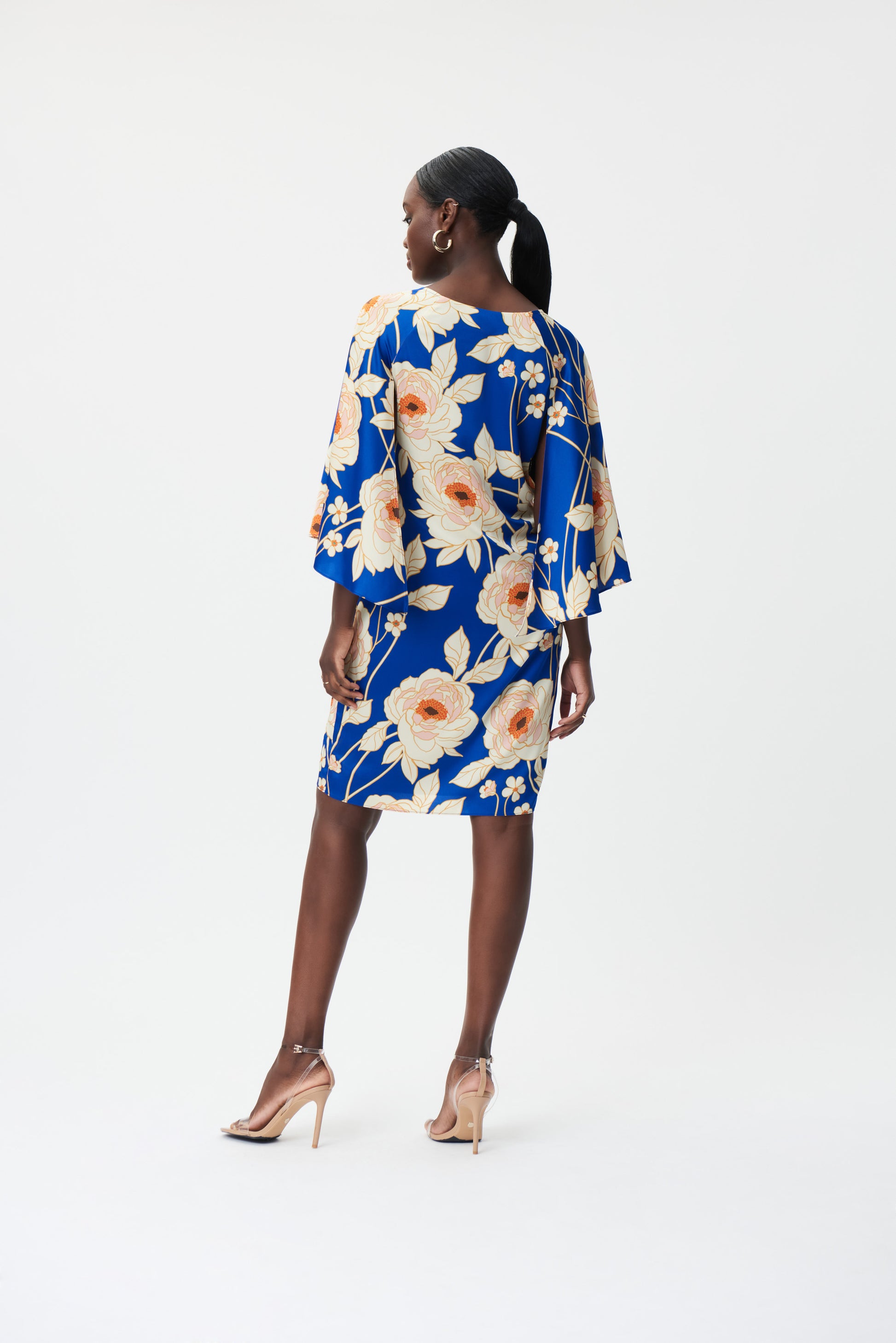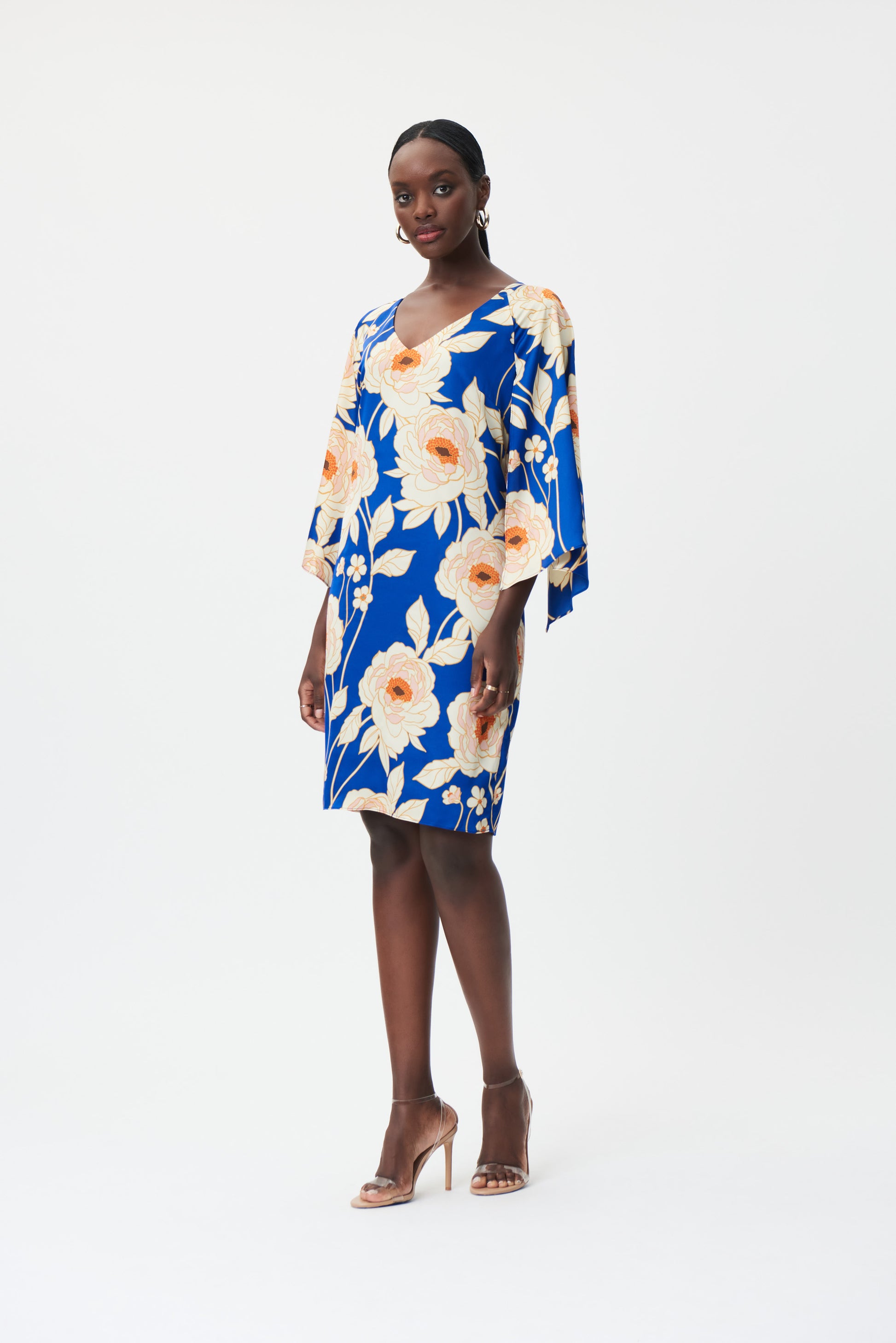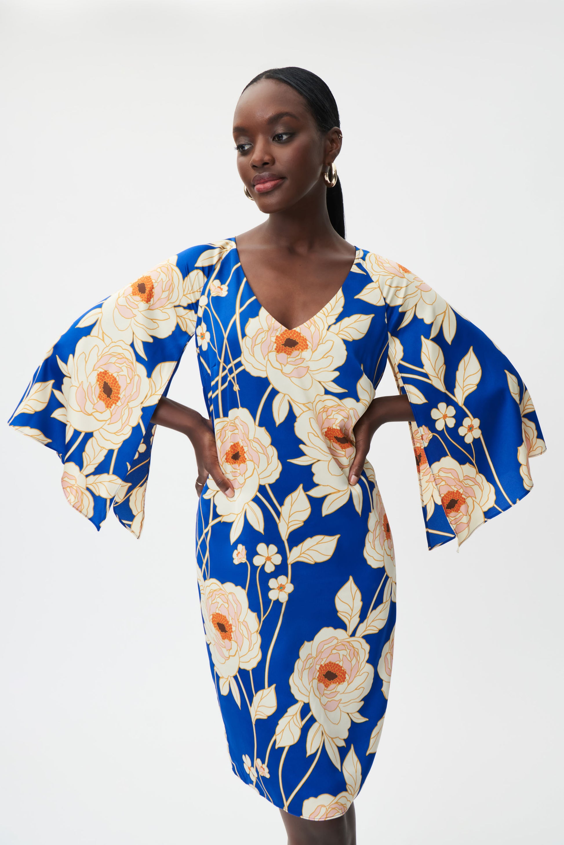 Vestido color azul con estampado de flores en color vainilla, cuenta con mangas largas y onduladas y corte de cuello en V.