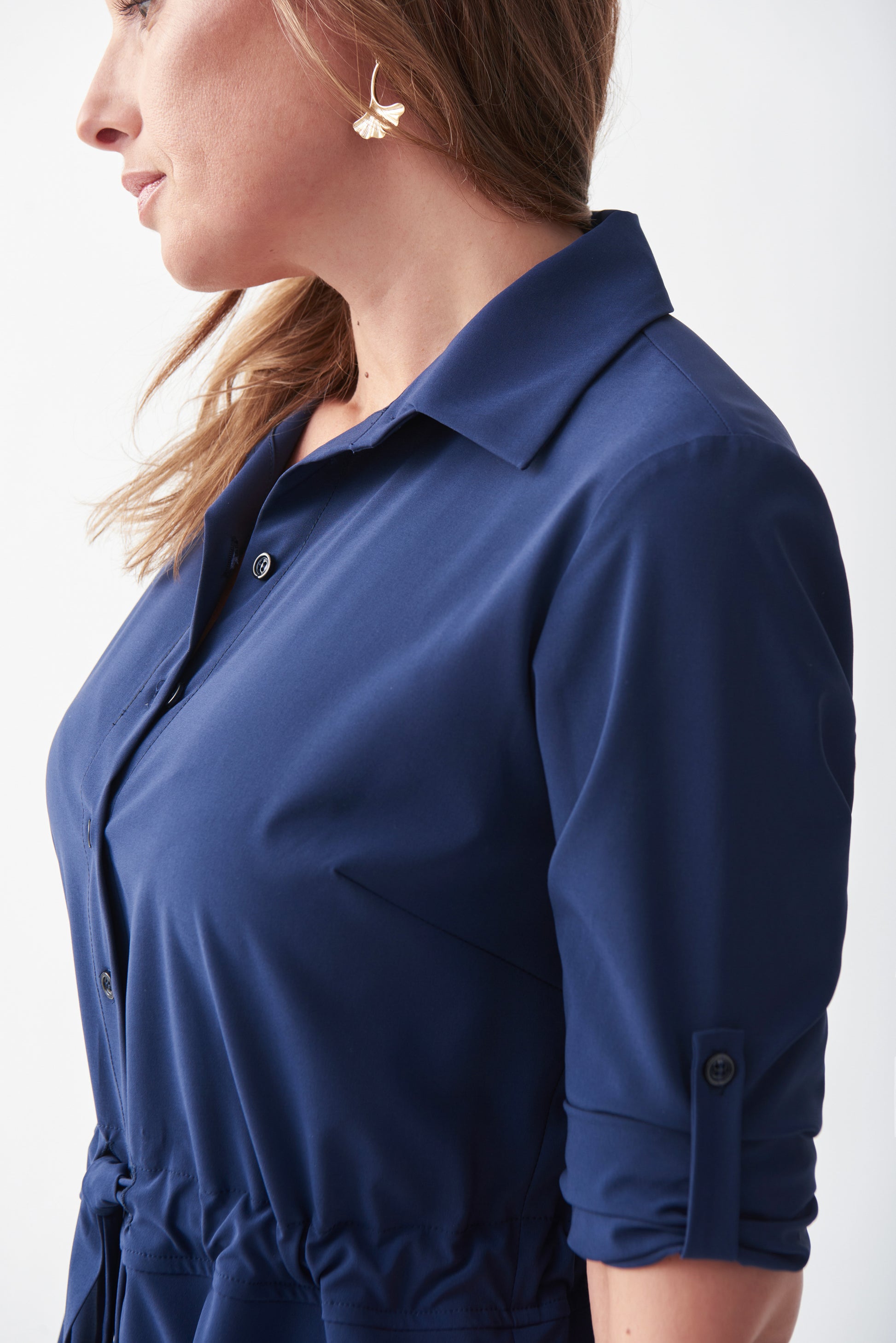 Vestido azul marino, estilo camisero, elástico con cintura ajustada y cuelo con detalla de nudo en la cintura, manga 3/4 remangada con trabillas, cierre delantero con botones