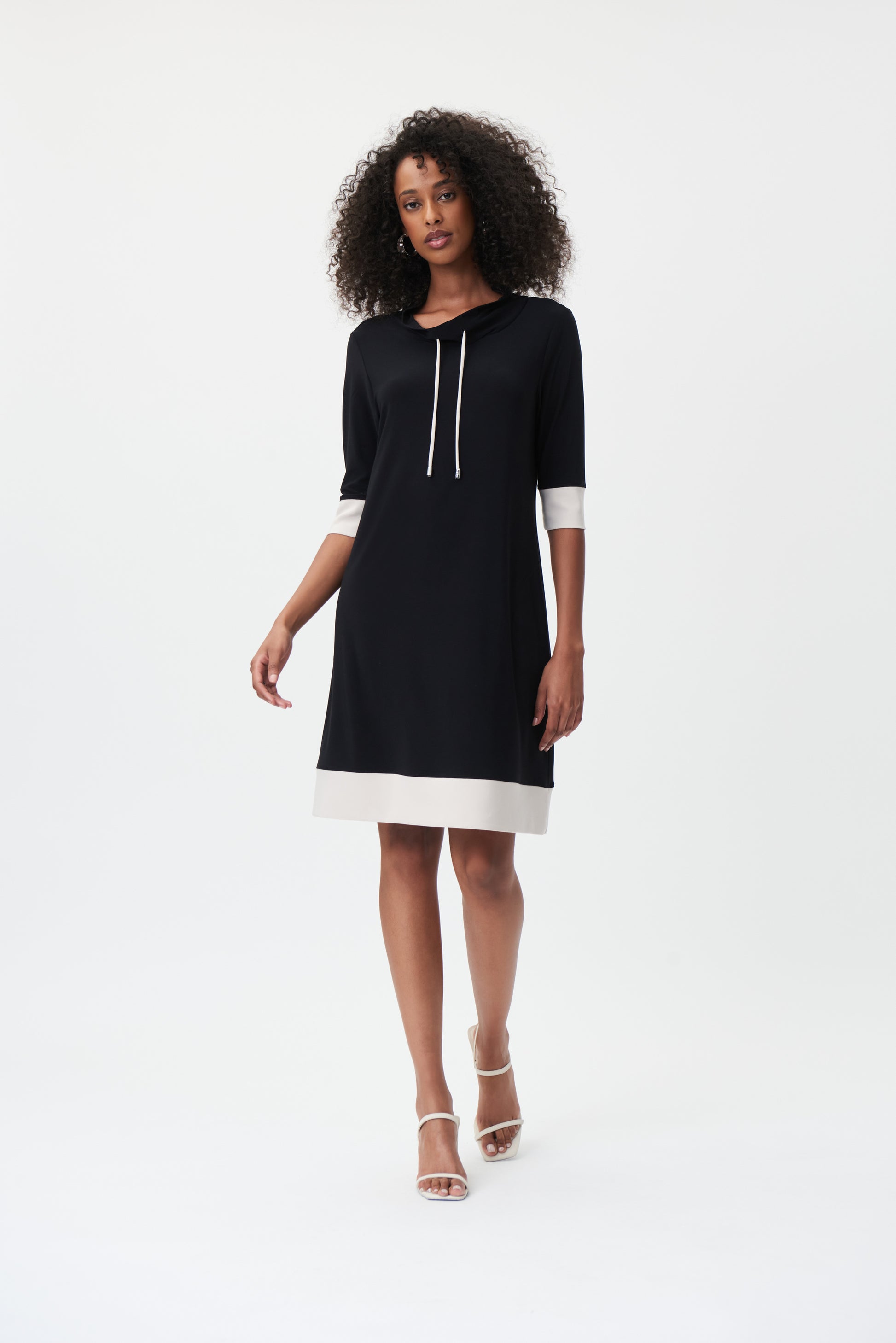 Vestido de suéter para dama en color negro, cuenta con capucha drapeada y escote con cordones, detalles en color beige en el dobladillo y las mangas.