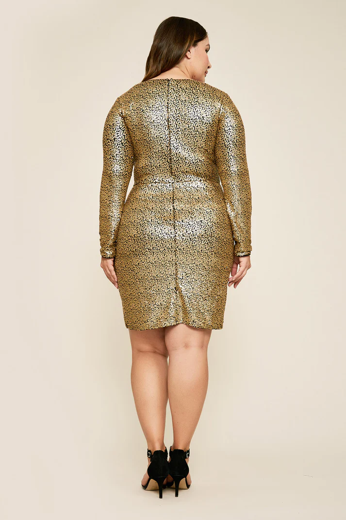 Vestido corto de lentejuela doradas con detalle drapeado de lado con escote v y manga larga con . Composición 90% poliéster 10% spandex
