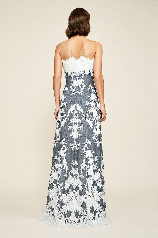 Vestido gris con encaje de flores blancas en cascada y ilusión transparente en escote sin mangas. Composición 100% poliéster
