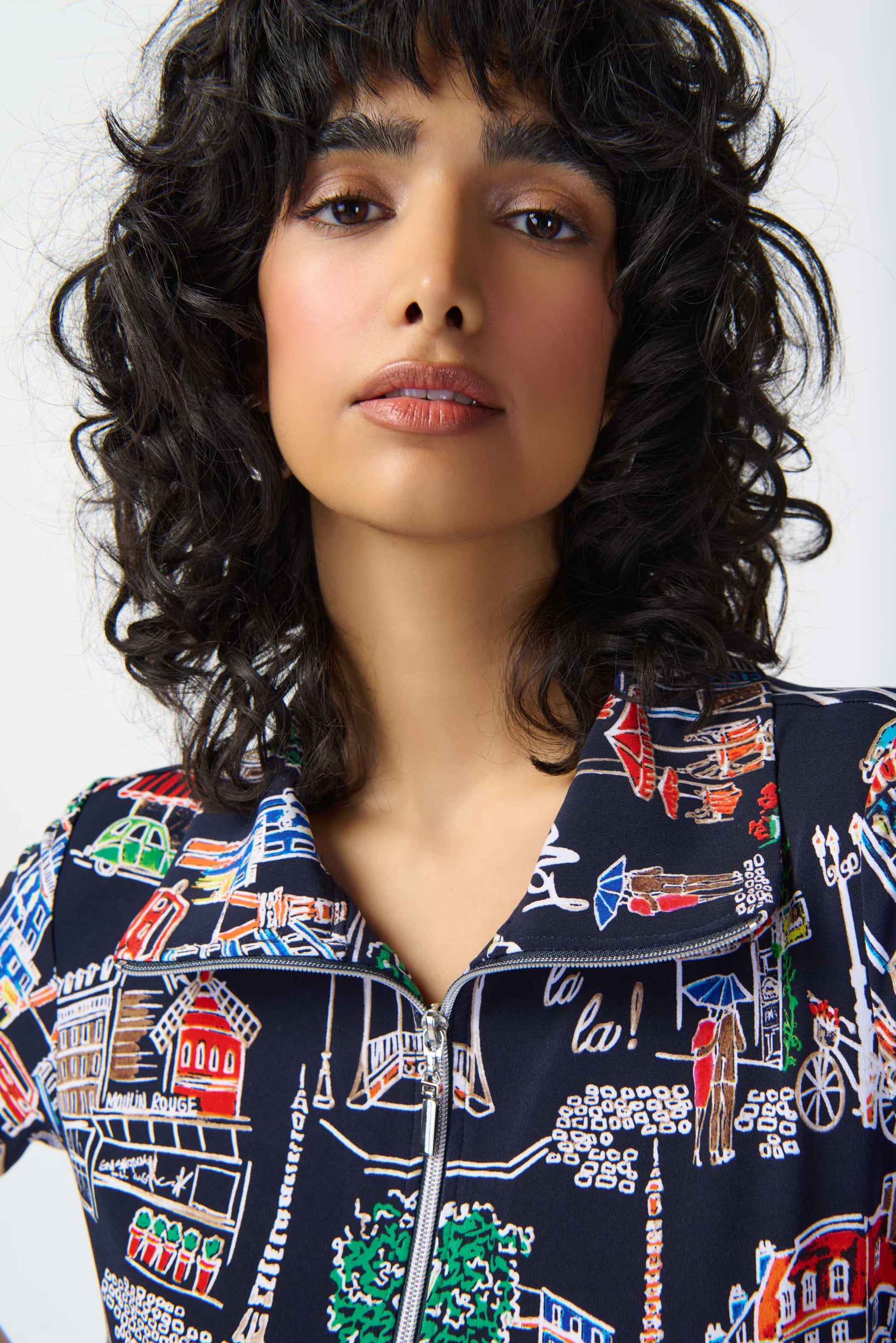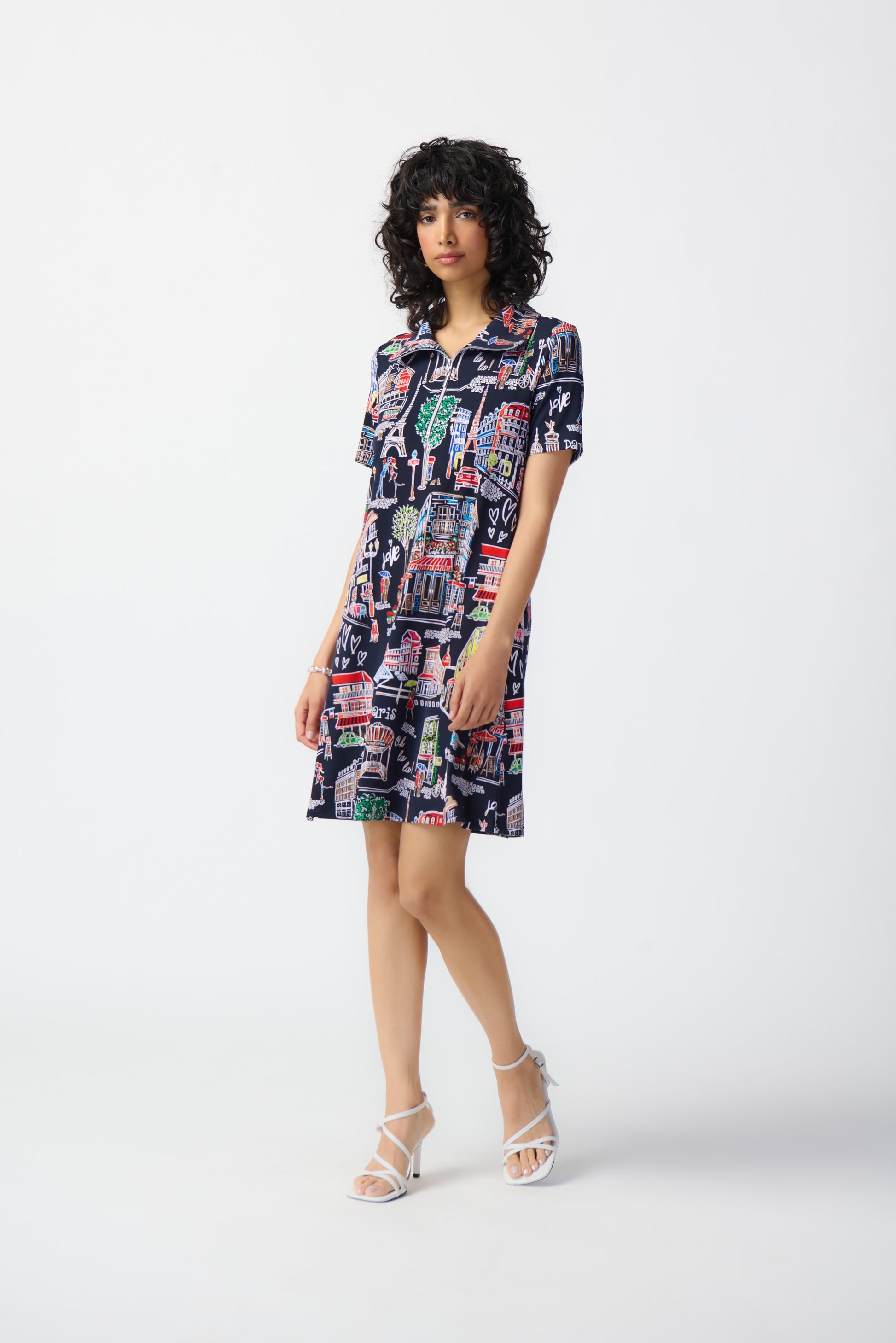 Este encantador vestido de punto de seda con un atractivo estampado de paisajes agregará un estilo único a su jornada laboral. La prenda está confeccionada en un elegante corte trapecio que garantiza una silueta chic pero relajada. La combinación de mangas cortas y escote con cremallera crea una combinación armoniosa que realza el atractivo general del diseño.
