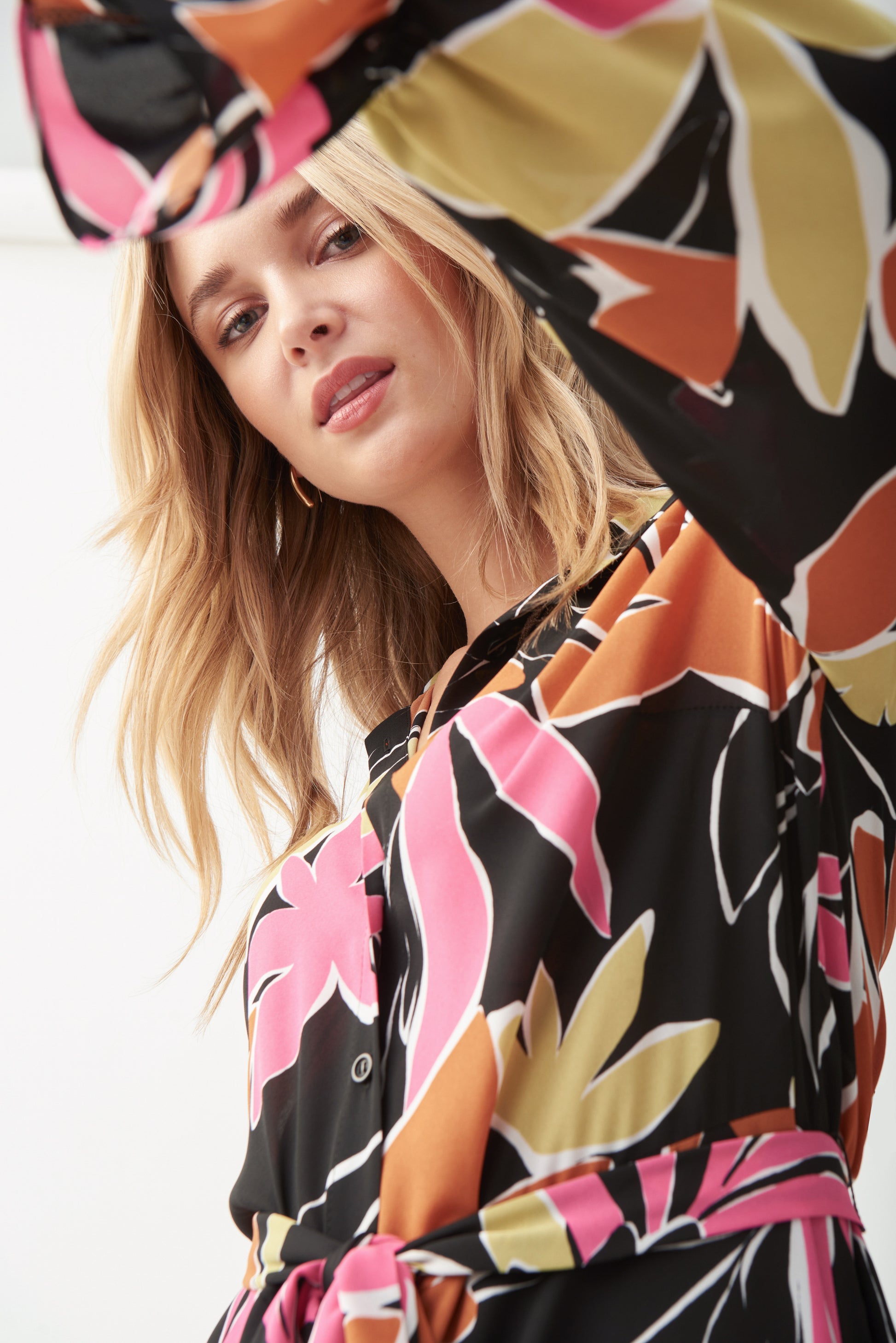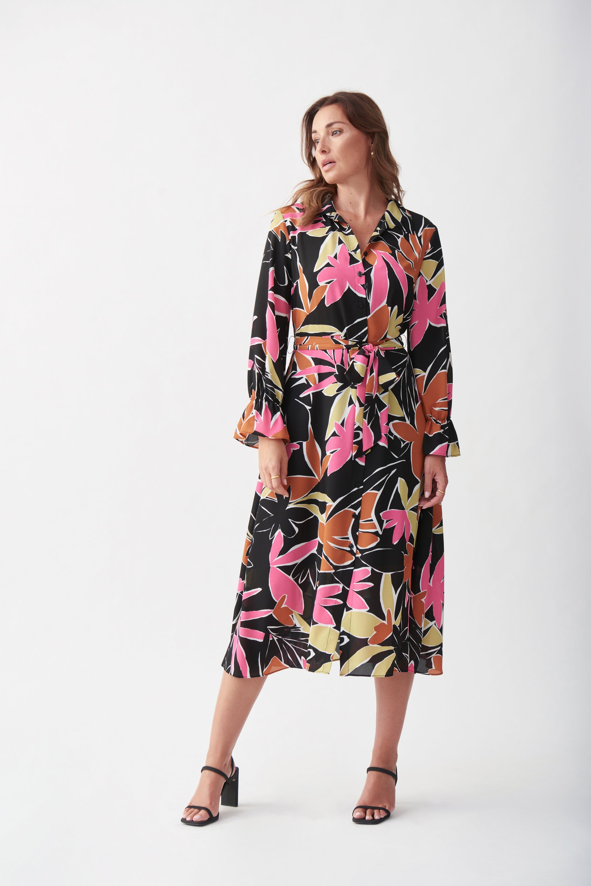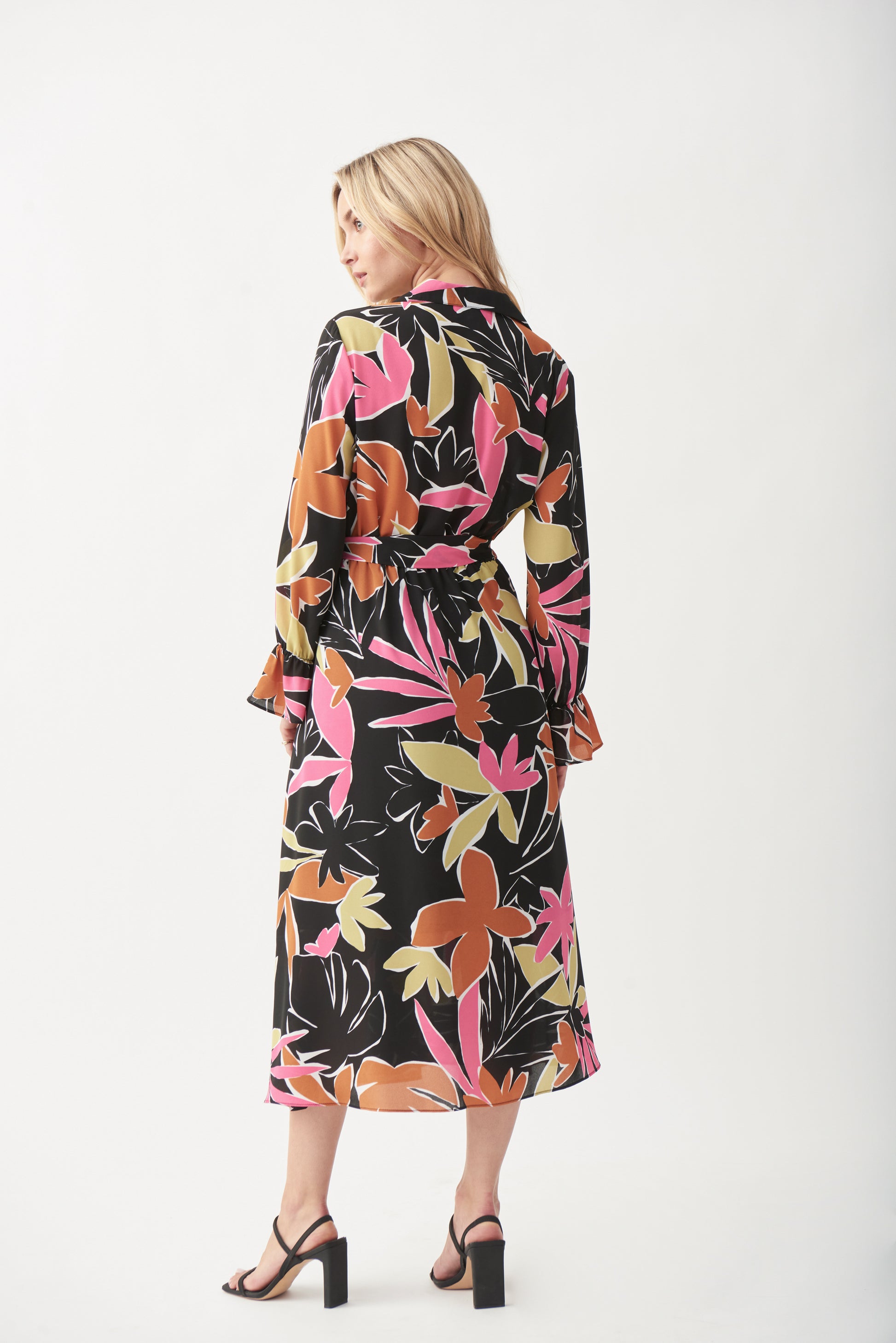 Vestido camisero color negro con estampado en tonos rosa, naranja y lima, con fajín en la cintura de la misma tela, manga con puño con volantes, cierre con botones al frente.