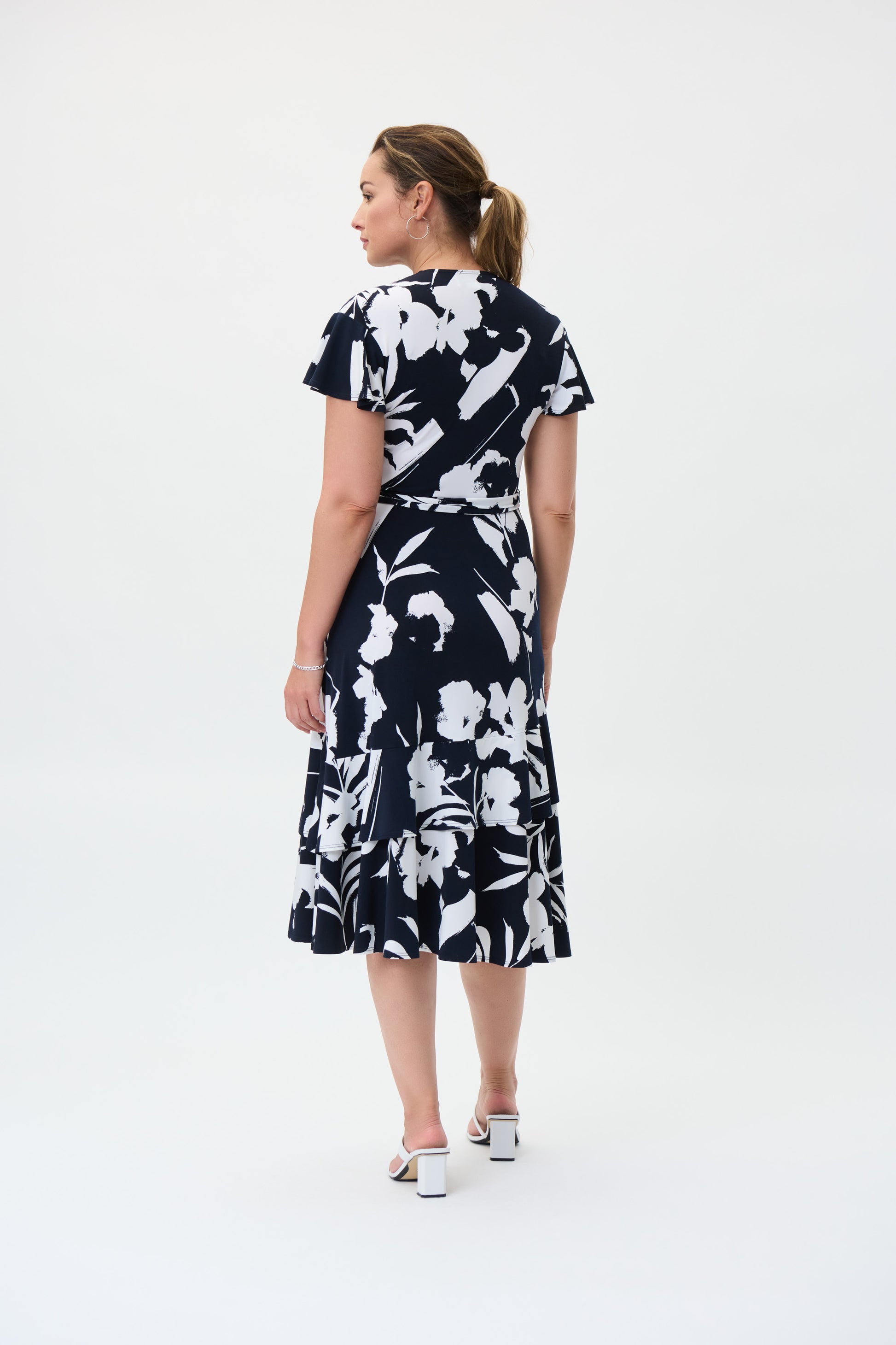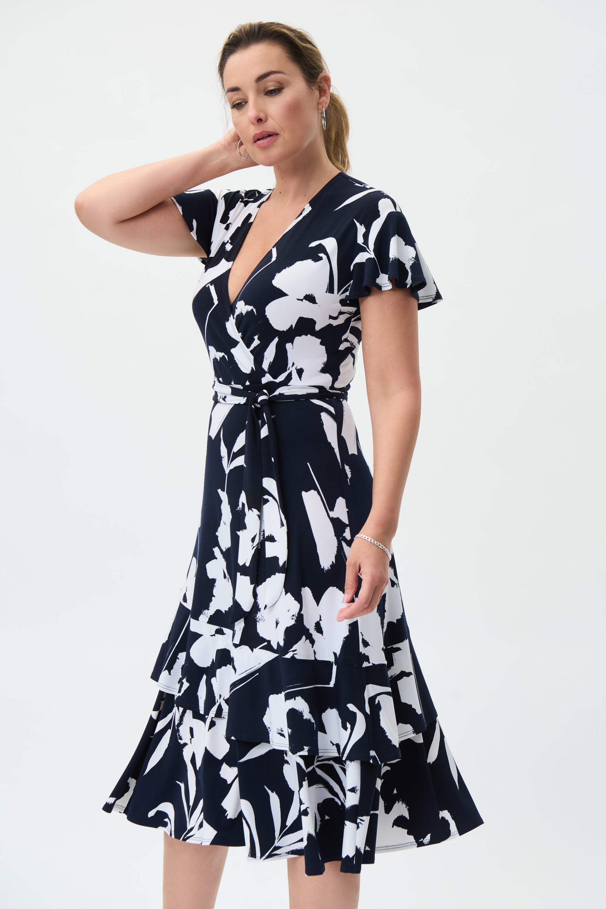 Vestido con estampado floral azul marino y vainilla, manga corta con volantes, frente cruzado, banda en la cintura de tela, falda con volantes.