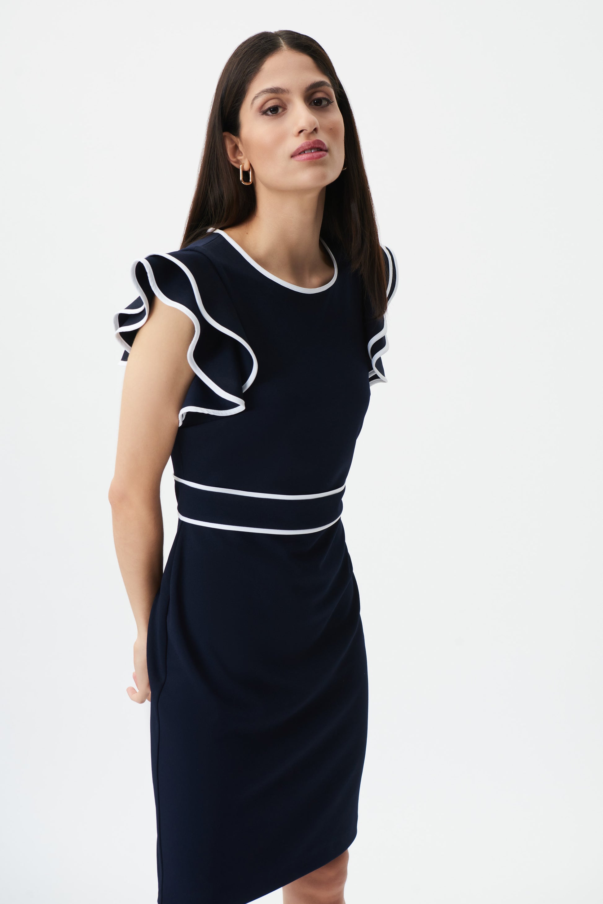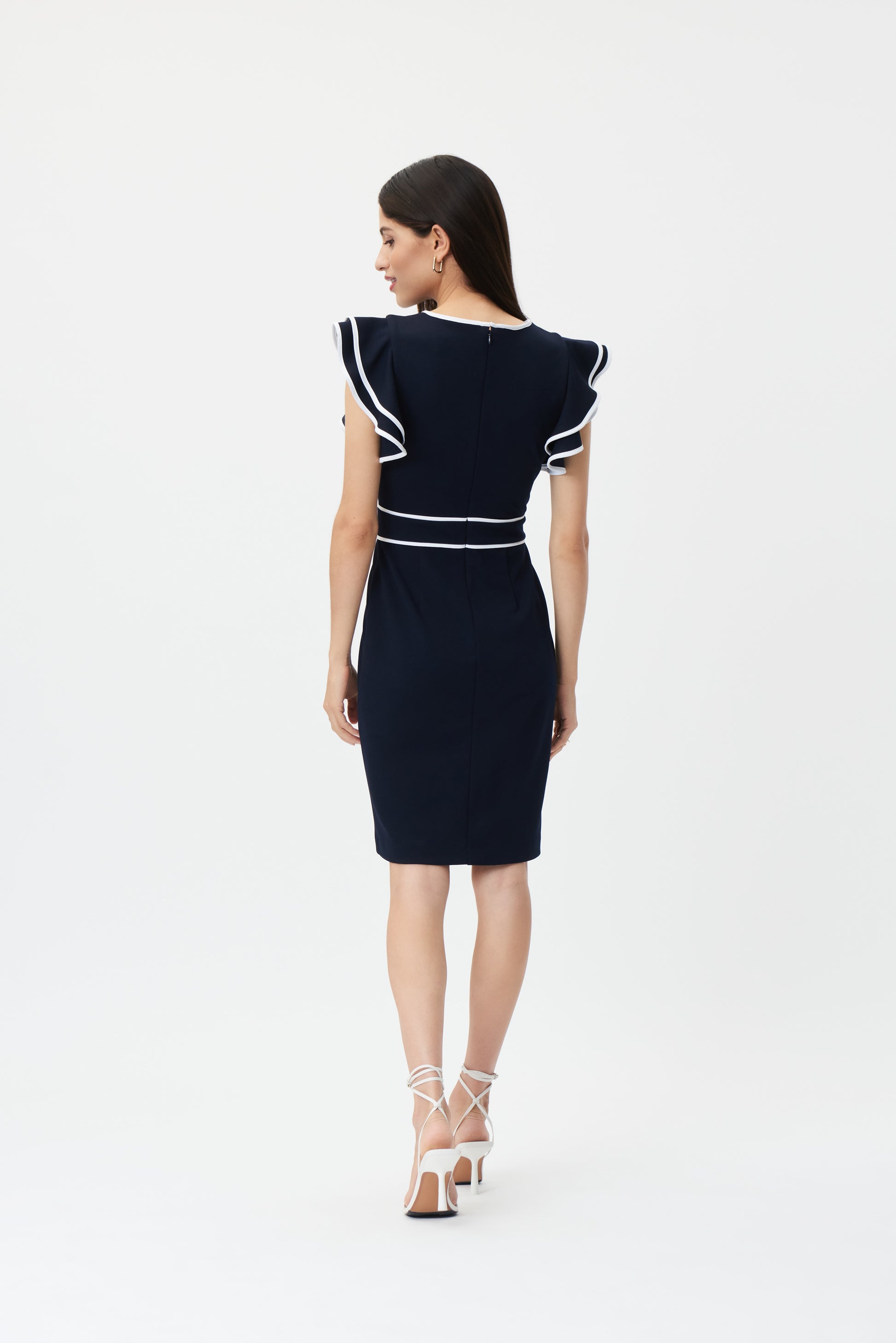 Vestido para dama en color azul marino, cuenta con unas mangas ajustadas y con volantes, tiene cremallera en la parte de atrás y sutiles detalles de en la cintura para complementar.