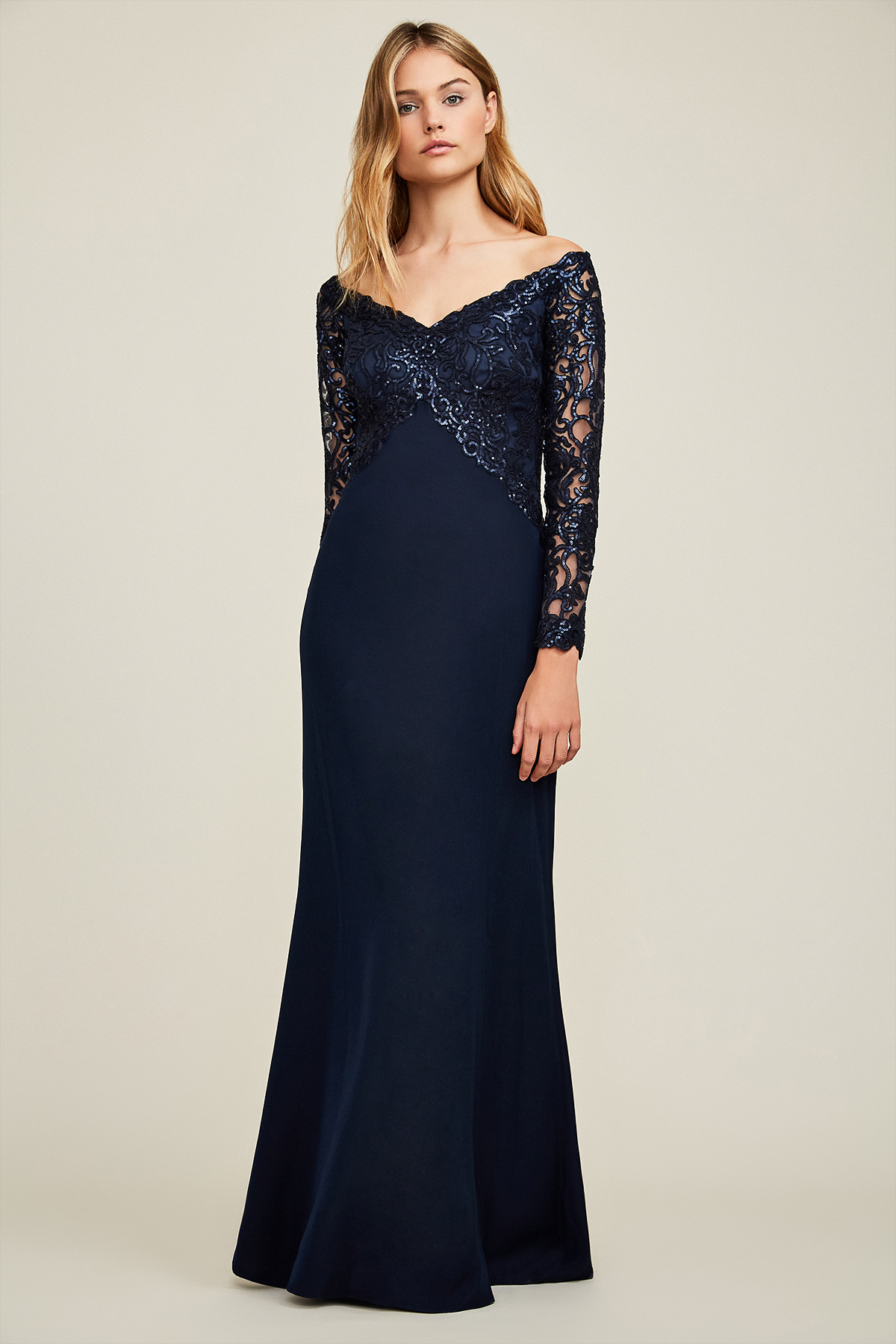 Vestido con manga larga y corpiño con escote de corazón bordado con lentejuelas azul y hombros descubiertos. Faldilla lisa. Composición 60% rayón 20% nylon 20% poliéster.