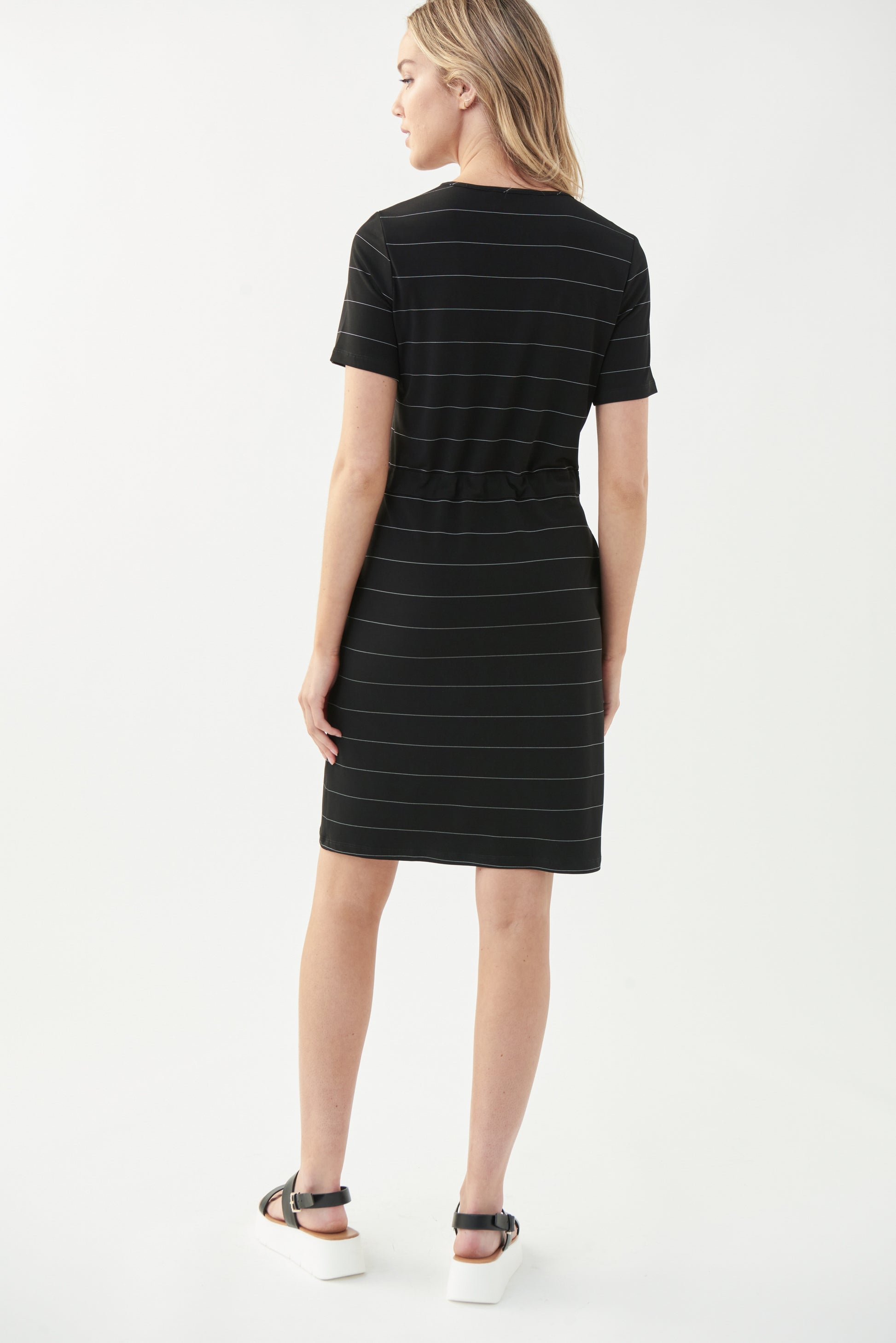 Vestido negro con sutiles líneas horizontales blancas, cuello en "V", manga corta, con jareta en la cintura y cordón, bolsas laterales.