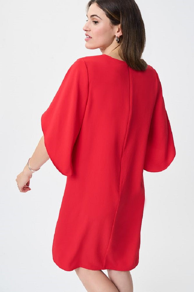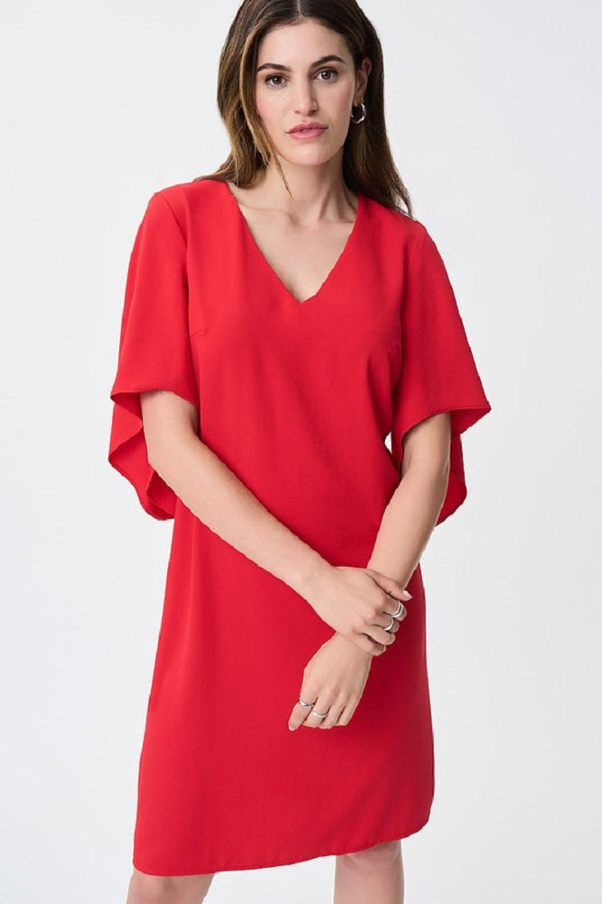 Vestido recto con escote en forma de V, mangas drapeadas y un favorecedor dobladillo hasta la rodilla.