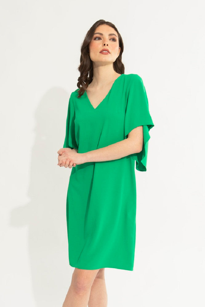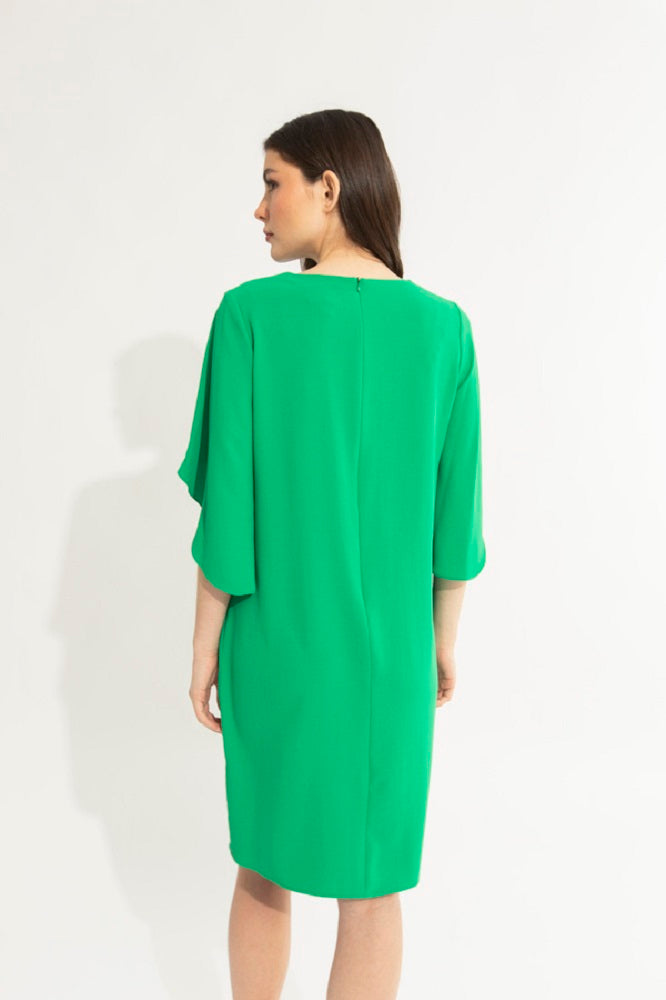 Vestido recto con escote en forma de V, mangas drapeadas y un favorecedor dobladillo hasta la rodilla.